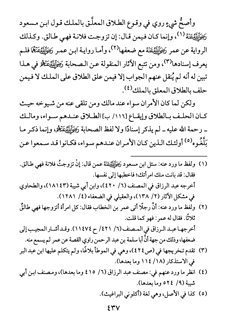 ولكن لما كان الأمران سواء عند مالك ومن تلقى عنه من شيوخه حيث كان الحلف بالطلاق وإيقاع [١١٦/ ب] الطلاق عندهم سواء، ومالك ــ رحمة الله عليه ــ لم يذكر إسنادًا ولا لفظ الصحابة - رضي الله عنهم -، وإنما ذكر ما بَلَّغُوه (¬٥) أولئك الذين كان الأمران عندهم سواء، فكانوا قد سمعوا عن