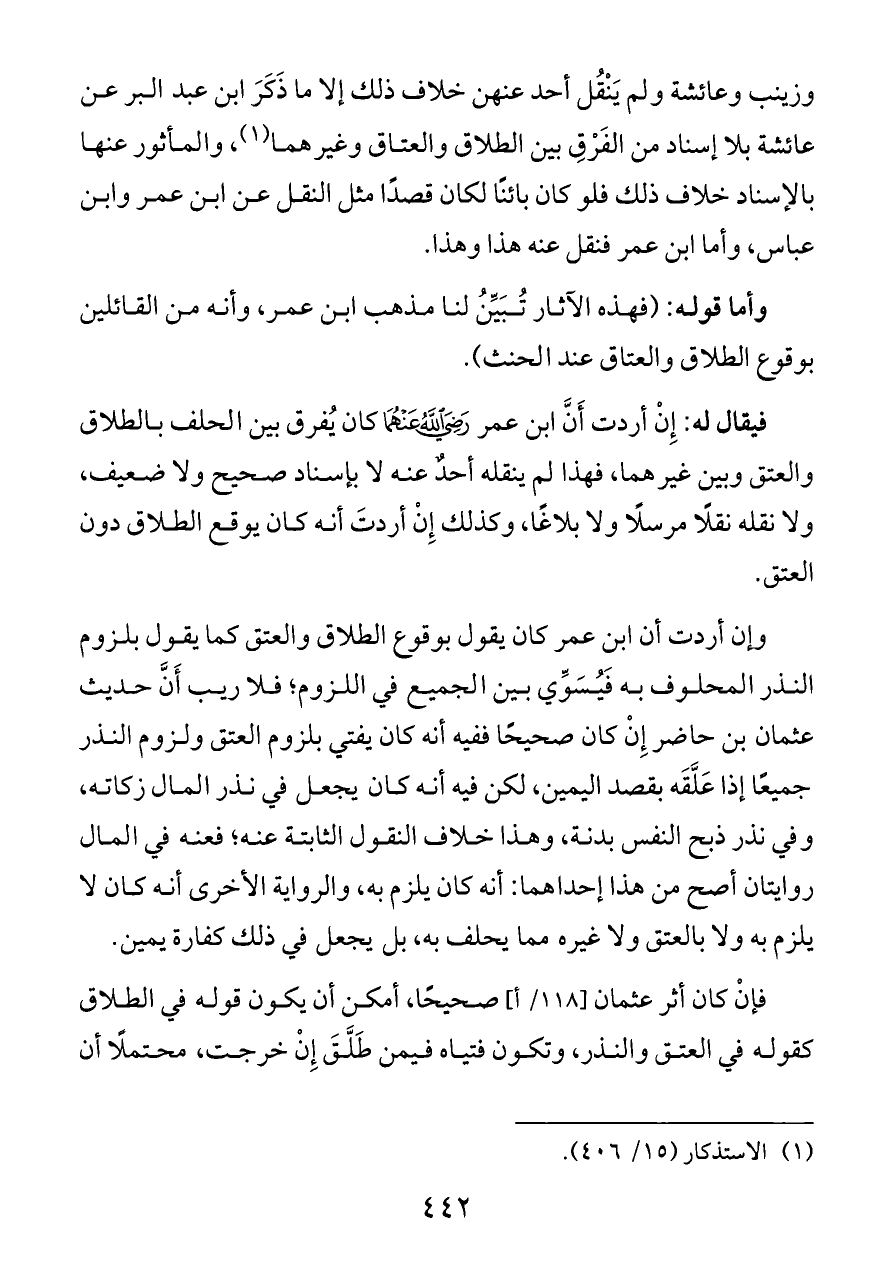 فإنْ كان أثر عثمان [١١٨/ أ] صحيحًا، أمكن أن يكون قوله في الطلاق كقوله في العتق والنذر، وتكون فتياه فيمن طَلَّقَ إِنْ خرجت، محتملًا أن