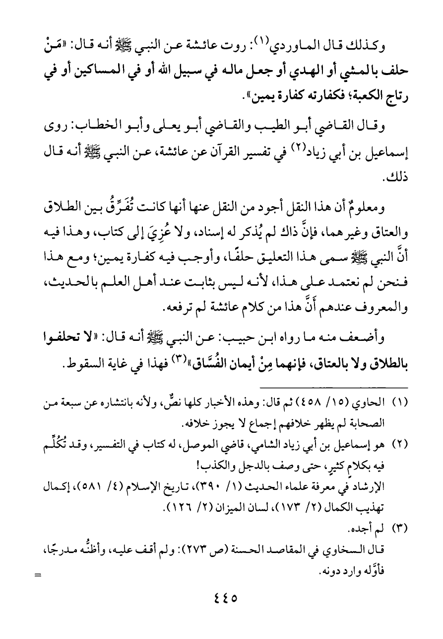 ومعلومٌ أن هذا النقل أجود من النقل عنها أنها كانت تُفَرِّقُ بين الطلاق والعتاق وغيرهما، فإنَّ ذاك لم يُذكر له إسناد، ولا عُزِيَ إلى كتاب، وهذا فيه أنَّ النبي - صلى الله عليه وسلم - سمى هذا التعليق حلفًا، وأوجب فيه كفارة يمين؛ ومع هذا فنحن لم نعتمد على هذا، لأنه ليس بثابت عند أهل العلم بالحديث، والمعروف عندهم أَنَّ هذا من كلام عائشة لم ترفعه.
