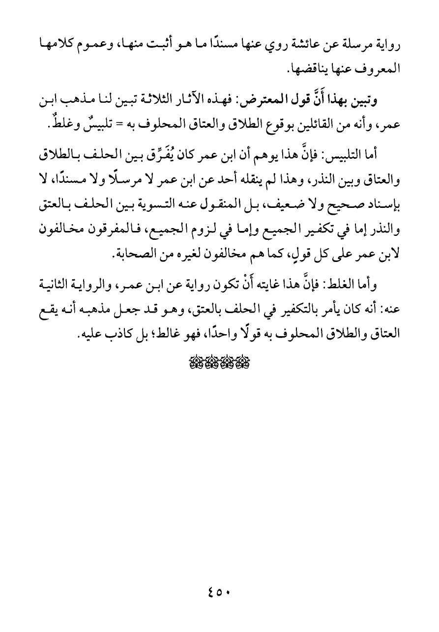 وتبين بهذا أَنَّ قول المعترض: فهذه الآثار الثلاثة تبين لنا مذهب ابن عمر، وأنه من القائلين بوقوع الطلاق والعتاق المحلوف به = تلبيسٌ وغلطٌ.