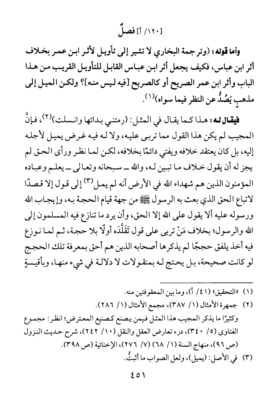 وأما قوله: (وترجمة البخاري لا تشير إلى تأويل لأثر ابن عمر بخلاف أثر ابن عباس، فكيف يجعل أثر ابن عباس القابل للتأويل القريب من هذا الباب وأثر ابن عمر الصريح أو كالصريح [فيه ليس منه]؟ ولكن الميل إلى مذهبٍ يَصُدُّ عن النظر فيما سواه) (¬١).