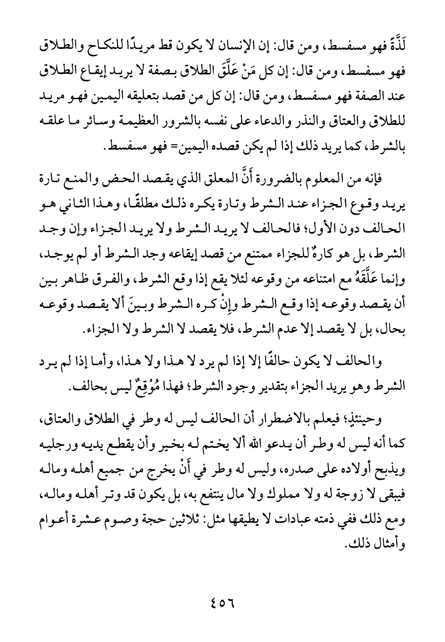 لَذَّةً فهو مسفسط، ومن قال: إن الإنسان لا يكون قط مريدًا للنكاح والطلاق فهو مسفسط، ومن قال: إن كل مَنْ عَلَّقَ الطلاق بصفة لا يريد إيقاع الطلاق عند الصفة فهو مسفسط، ومن قال: إن كل من قصد بتعليقه اليمين فهو مريد للطلاق والعتاق والنذر والدعاء على نفسه بالشرور العظيمة وسائر ما علقه بالشرط، كما يريد ذلك إذا لم يكن قصده اليمين= فهو مسفسط.