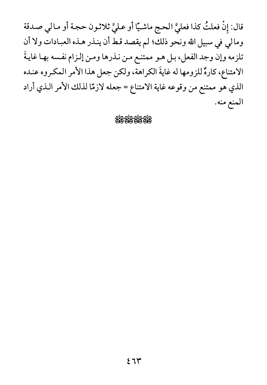 قال: إِنْ فعلتُ كذا فعليَّ الحج ماشيًا أو عليَّ ثلاثون حجة أو مالي صدقة ومالي في سبيل الله ونحو ذلك؛ لم يقصد قط أن ينذر هذه العبادات ولا أن تلزمه وإن وجد الفعل، بل هو ممتنع من نذرها ومن إلزام نفسه بها غايةَ الامتناع، كارهٌ للزومها له غايةَ الكراهة، ولكن جعل هذا الأمر المكروه عنده الذي هو ممتنع من وقوعه غاية الامتناع = جعله لازمًا لذلك الأمر الذي أراد المنع منه.