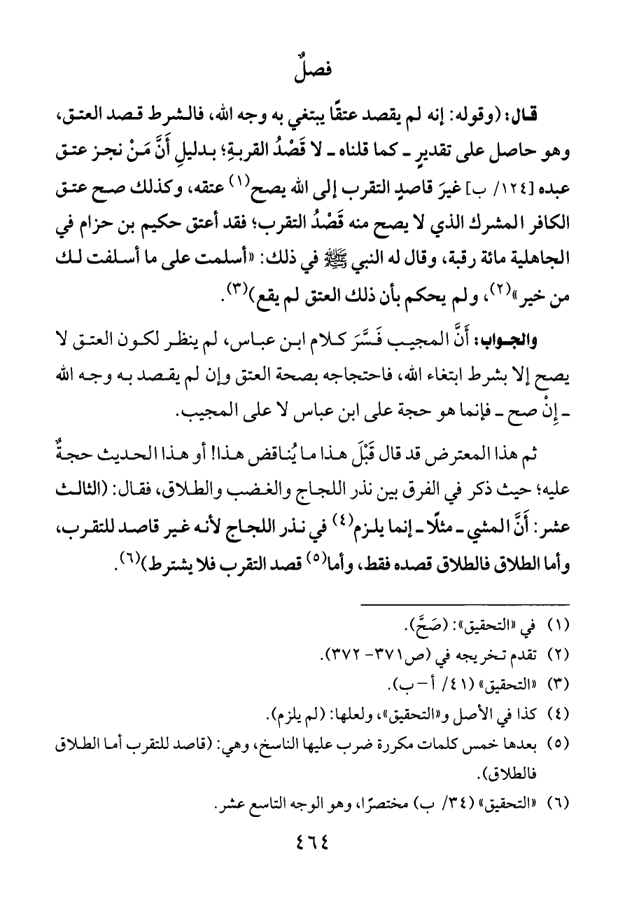 قال: (وقوله: إنه لم يقصد عتقًا يبتغي به وجه الله، فالشرط قصد العتق، وهو حاصل على تقديرٍ ــ كما قلناه ــ لا قَصْدُ القربةِ؛ بدليلِ أَنَّ مَنْ نجز عتق عبده [١٢٤/ ب] غيرَ قاصدٍ التقرب إلى الله يصح (¬١) عتقه، وكذلك صح عتق الكافر المشرك الذي لا يصح منه قَصْدُ التقرب؛ فقد أعتق حكيم بن حزام في الجاهلية مائة رقبة، وقال له النبي - صلى الله عليه وسلم - في ذلك: «أسلمت على ما أسلفت لك من خير» (¬٢)، ولم يحكم بأن ذلك العتق لم يقع) (¬٣).