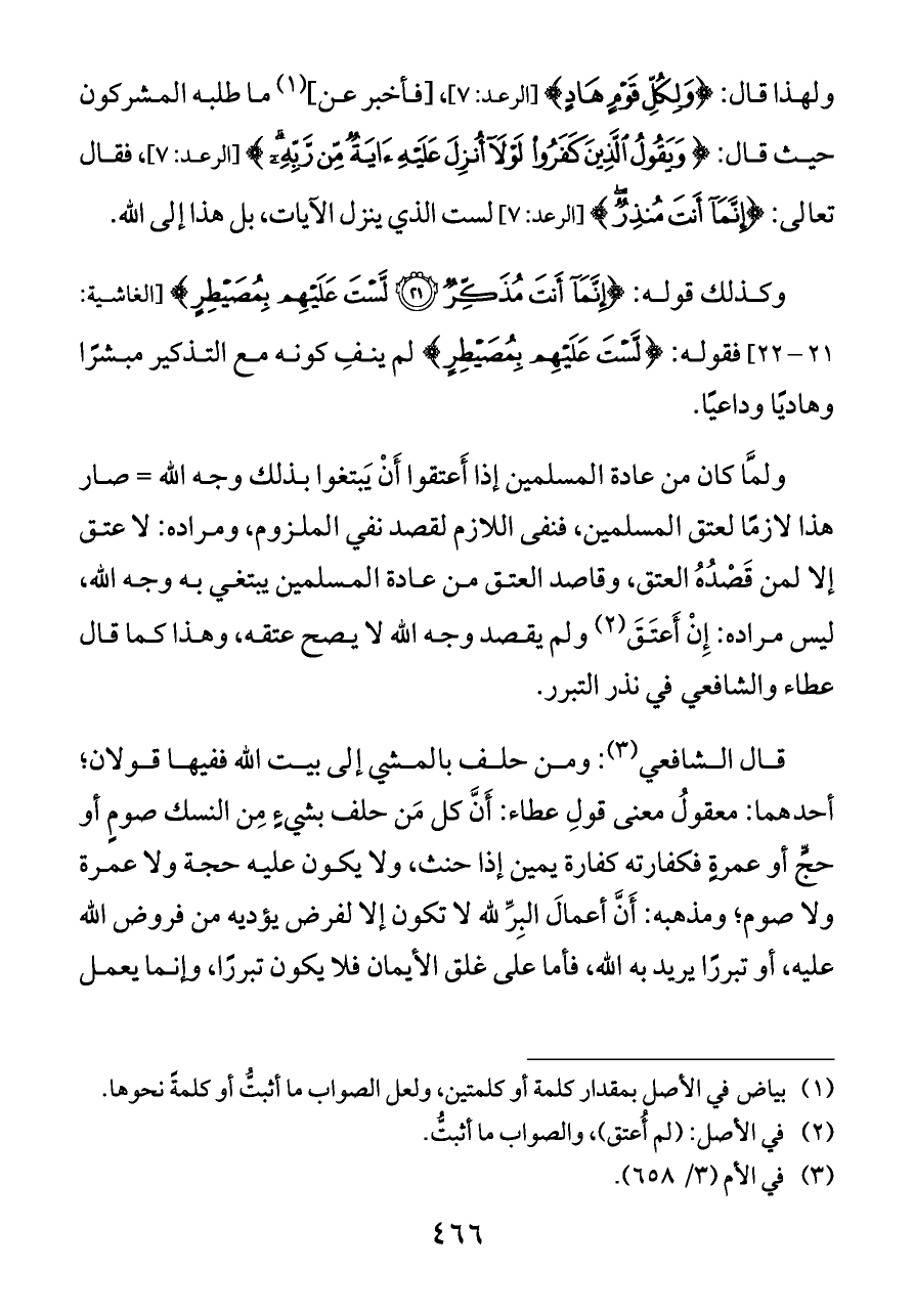 ولَمَّا كان من عادة المسلمين إذا أَعتقوا أَنْ يَبتغوا بذلك وجه الله = صار هذا لازمًا لعتق المسلمين، فنفى اللازم لقصد نفي الملزوم، ومراده: لا عتق إلا لمن قَصْدُهُ العتق، وقاصد العتق من عادة المسلمين يبتغي به وجه الله، ليس مراده: إِنْ أَعتَقَ (¬٢) ولم يقصد وجه الله لا يصح عتقه، وهذا كما قال عطاء والشافعي في نذر التبرر.