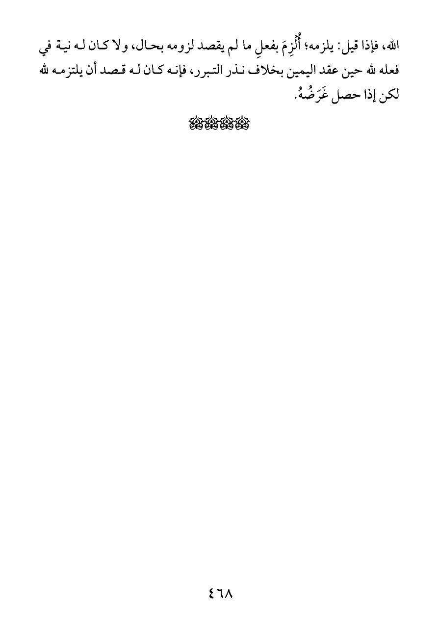 الله، فإذا قيل: يلزمه؛ أُلْزِمَ بفعلِ ما لم يقصد لزومه بحال، ولا كان له نية في فعله لله حين عقد اليمين بخلاف نذر التبرر، فإنه كان له قصد أن يلتزمه لله لكن إذا حصل غَرَضُهُ.