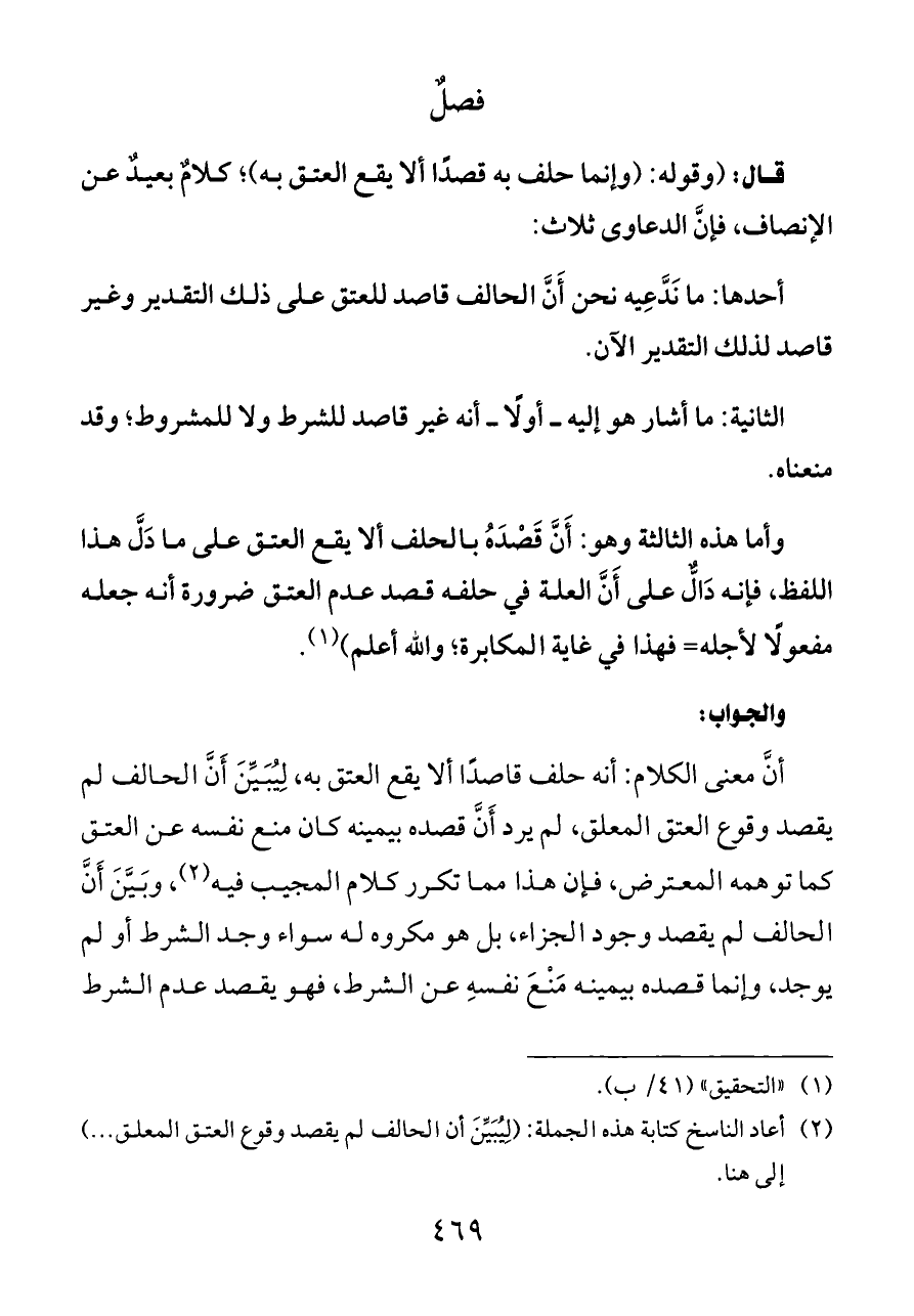 قال: (وقوله: (وإنما حلف به قصدًا ألا يقع العتق به)؛ كلامٌ بعيدٌ عن الإنصاف، فإنَّ الدعاوى ثلاث: