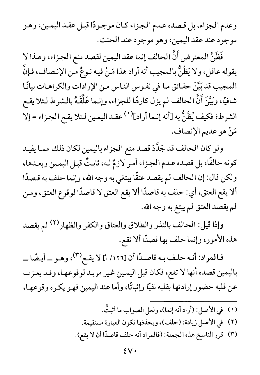 (¬٣) كرر الناسخ هذه الجملة: (فالمراد أنه حلف قاصدًا أن لا يقع).
