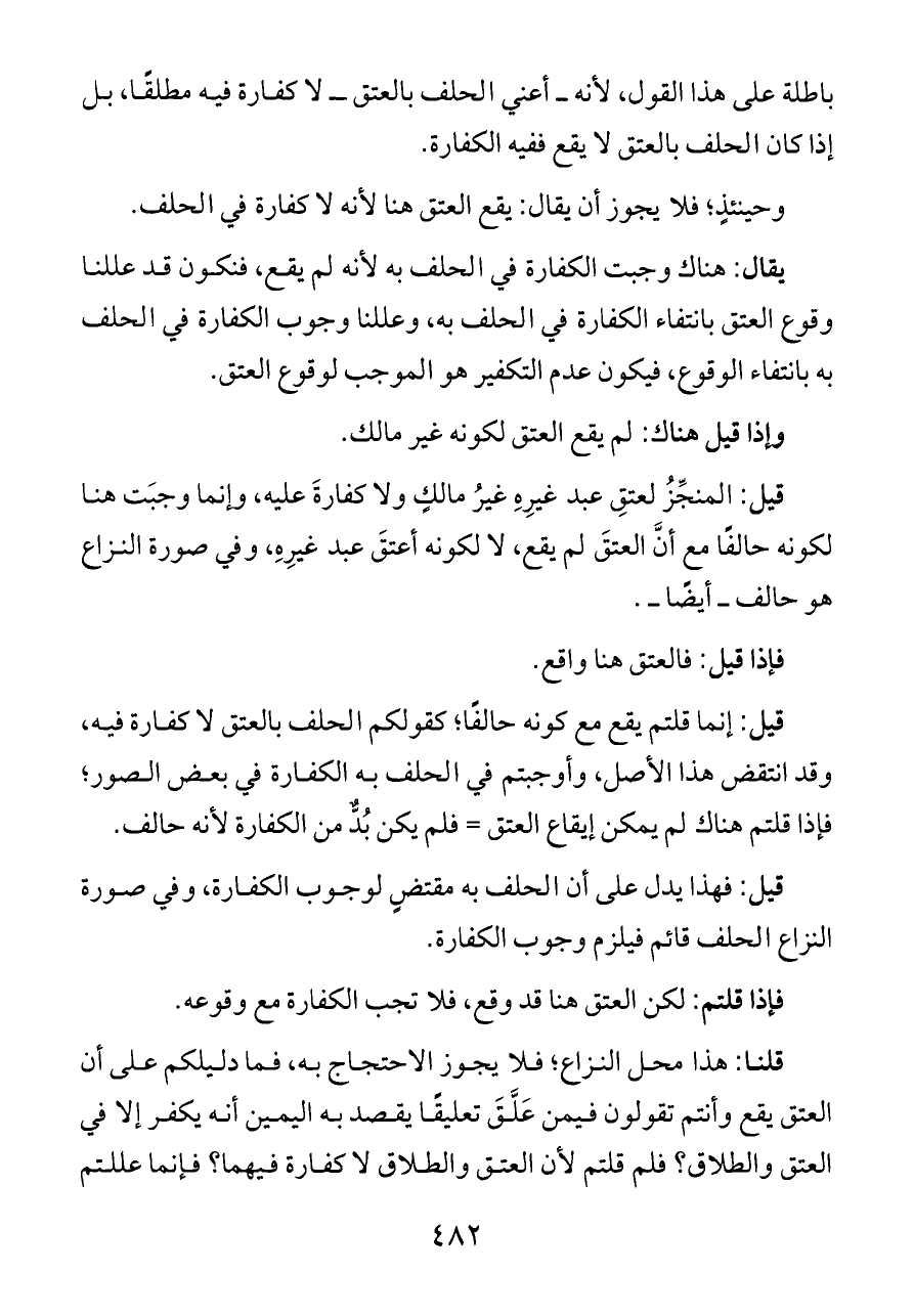 قلنا: هذا محل النزاع؛ فلا يجوز الاحتجاج به، فما دليلكم على أن العتق يقع وأنتم تقولون فيمن عَلَّقَ تعليقًا يقصد به اليمين أنه يكفر إلا في العتق والطلاق؟ فلم قلتم لأن العتق والطلاق لا كفارة فيهما؟ فإنما عللتم