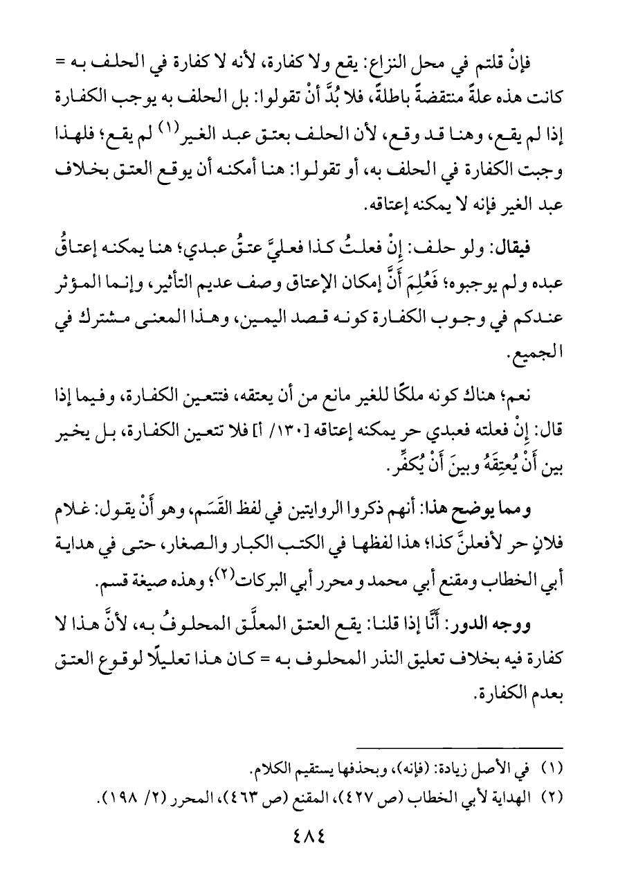 ومما يوضح هذا: أنهم ذكروا الروايتين في لفظ القَسَم، وهو أَنْ يقول: غلام فلانٍ حر لأفعلنَّ كذا؛ هذا لفظها في الكتب الكبار والصغار، حتى في هداية أبي الخطاب ومقنع أبي محمد ومحرر أبي البركات (¬٢)؛ وهذه صيغة قسم.