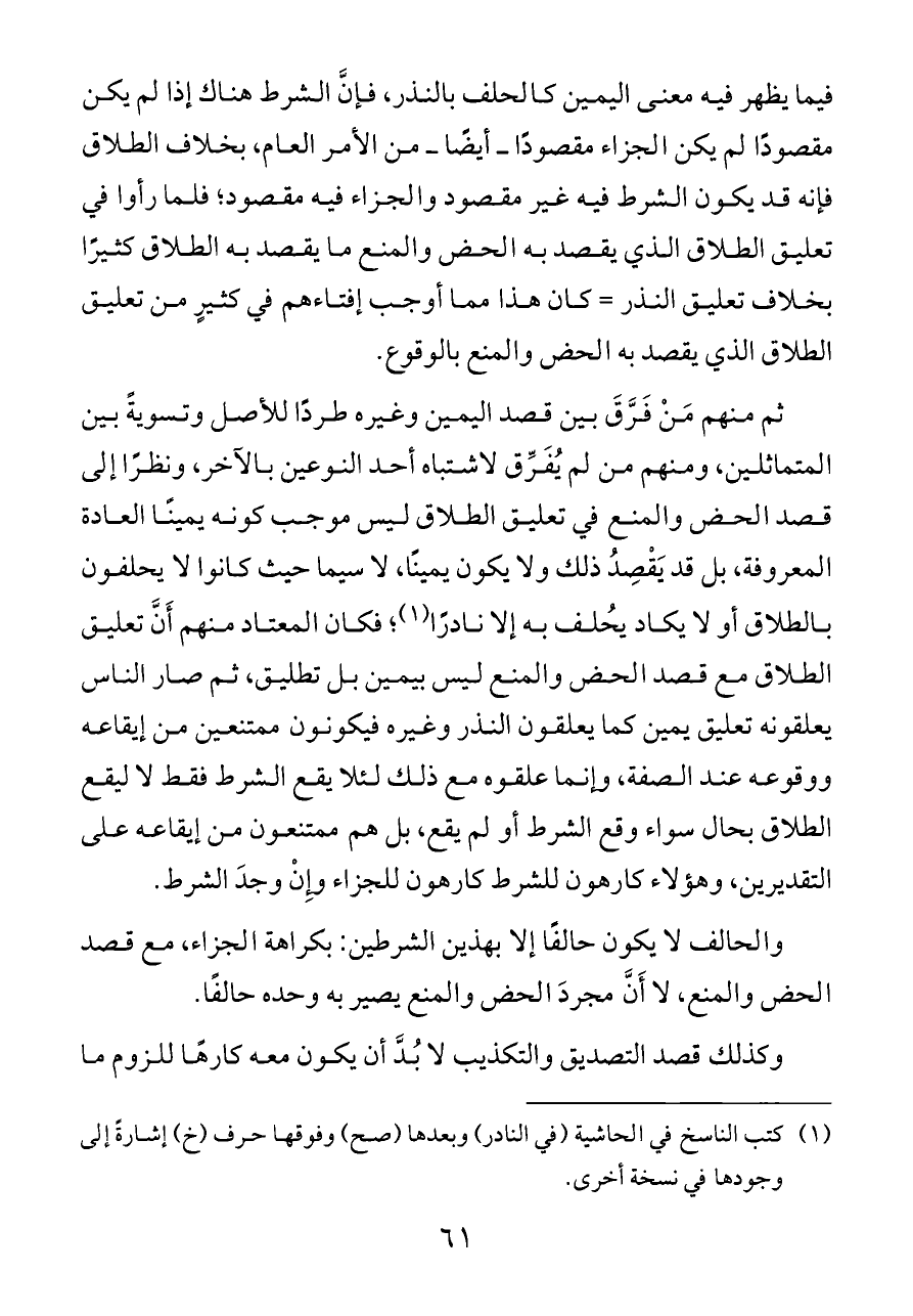 فيما يظهر فيه معنى اليمين كالحلف بالنذر، فإنَّ الشرط هناك إذا لم يكن مقصودًا لم يكن الجزاء مقصودًا ــ أيضًا ــ من الأمر العام، بخلاف الطلاق فإنه قد يكون الشرط فيه غير مقصود والجزاء فيه مقصود؛ فلما رأوا في تعليق الطلاق الذي يقصد به الحض والمنع ما يقصد به الطلاق كثيرًا بخلاف تعليق النذر = كان هذا مما أوجب إفتاءهم في كثيرٍ من تعليق الطلاق الذي يقصد به الحض والمنع بالوقوع.