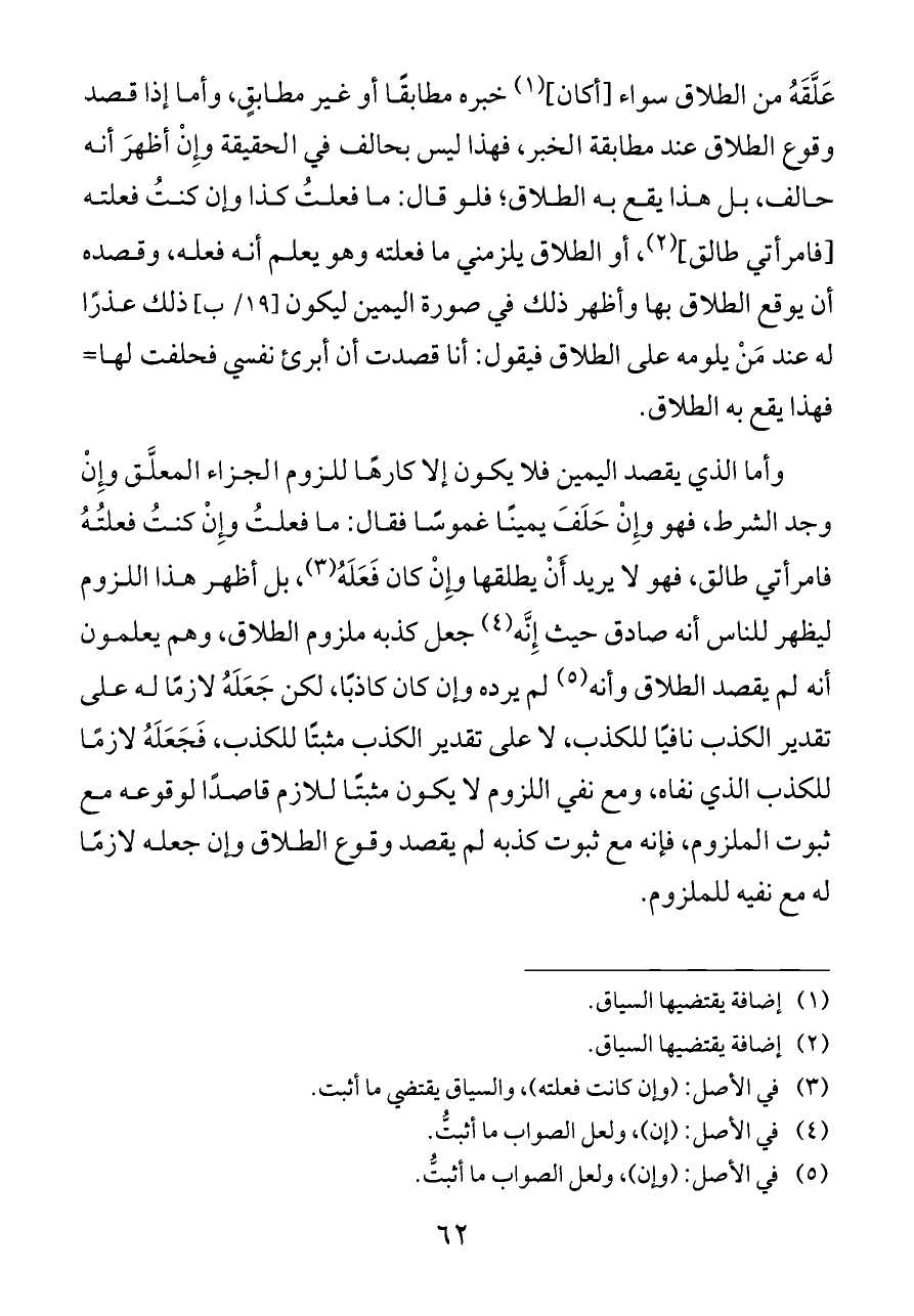 وأما الذي يقصد اليمين فلا يكون إلا كارهًا للزوم الجزاء المعلَّق وإِنْ وجد الشرط، فهو وإِنْ حَلَفَ يمينًا غموسًا فقال: ما فعلتُ وإِنْ كنتُ فعلتُهُ فامرأتي طالق، فهو لا يريد أَنْ يطلقها وإِنْ كان فَعَلَهُ (¬٣)، بل أظهر هذا اللزوم ليظهر للناس أنه صادق حيث إِنَّه (¬٤) جعل كذبه ملزوم الطلاق، وهم يعلمون أنه لم يقصد الطلاق وأنه (¬٥) لم يرده وإن كان كاذبًا، لكن جَعَلَهُ لازمًا له على تقدير الكذب نافيًا للكذب، لا على تقدير الكذب مثبتًا للكذب، فَجَعَلَهُ لازمًا للكذب الذي نفاه، ومع نفي اللزوم لا يكون مثبتًا للازم قاصدًا لوقوعه مع ثبوت الملزوم، فإنه مع ثبوت كذبه لم يقصد وقوع الطلاق وإن جعله لازمًا له مع نفيه للملزوم.