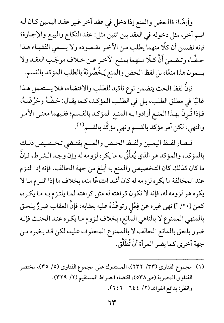 وأيضًا؛ فالحض والمنع إذا دخل في عقد آخر غير عقد اليمين كان له اسم آخر، مثل دخوله في العقد بين اثنين مثل: عقد النكاح والبيع والإجارة؛ فإنه تضمن أن كلًا منهما يطلب من الآخر مقصوده ولا يسمي الفقهاء هذا حضًّا، وتضمن أَنَّ كلًا منهما يمنع الآخر عن خلاف موجَب العقد ولا يسمون هذا منعًا، بل لفظ الحض والمنع يَخُصُّونَهُ بالطلب المؤكد بالقسم.