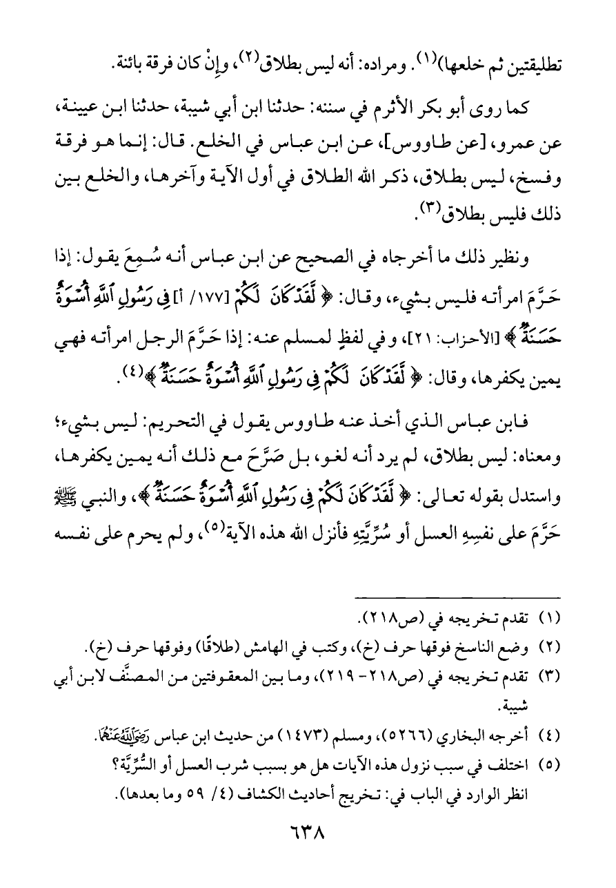 فابن عباس الذي أخذ عنه طاووس يقول في التحريم: ليس بشيء؛ ومعناه: ليس بطلاق، لم يرد أنه لغو، بل صَرَّحَ مع ذلك أنه يمين يكفرها، واستدل بقوله تعالى: {لَقَدْ كَانَ لَكُمْ فِي رَسُولِ اللَّهِ أُسْوَةٌ حَسَنَةٌ}، والنبي - صلى الله عليه وسلم - حَرَّمَ على نفسِهِ العسل أو سُرِّيَّتِهِ فأنزل الله هذه الآية (¬٥)، ولم يحرم على نفسه