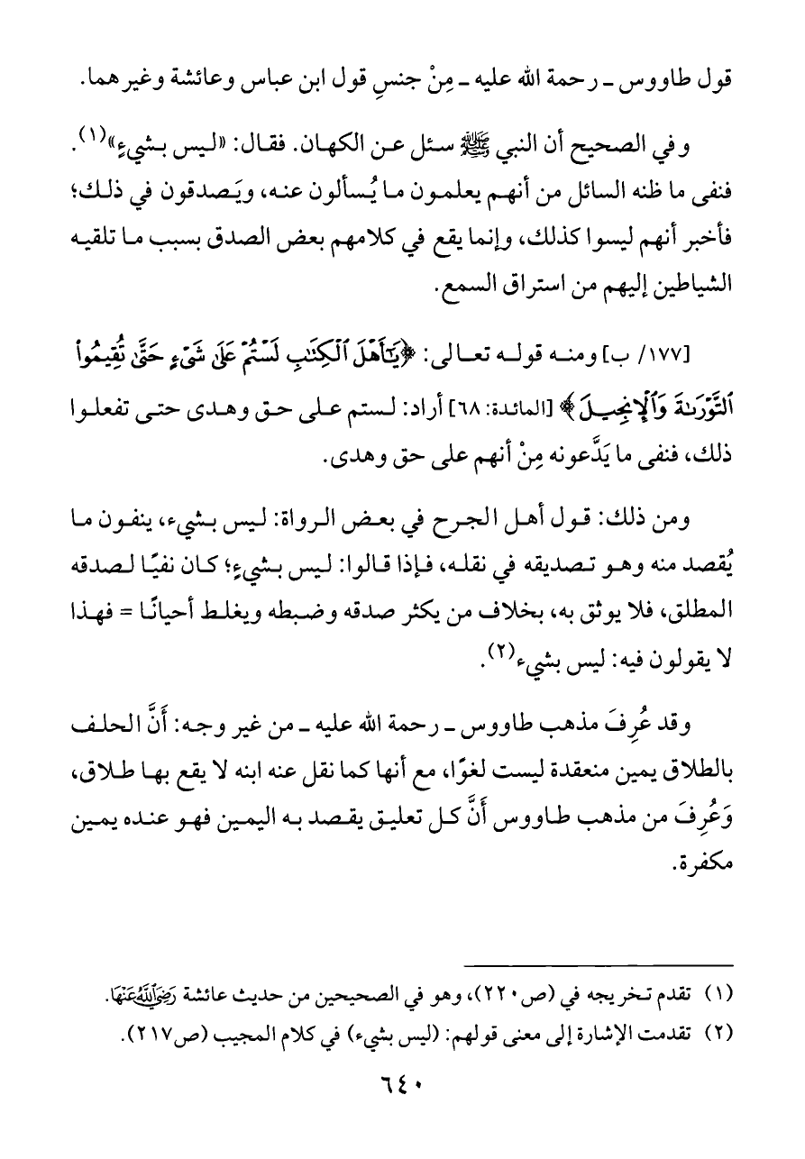 [١٧٧/ ب] ومنه قوله تعالى: {يَاأَهْلَ الْكِتَابِ لَسْتُمْ عَلَى شَيْءٍ حَتَّى تُقِيمُوا التَّوْرَاةَ وَالْإِنْجِيلَ} [المائدة: ٦٨] أراد: لستم على حق وهدى حتى تفعلوا ذلك، فنفى ما يَدَّعونه مِنْ أنهم على حق وهدى.