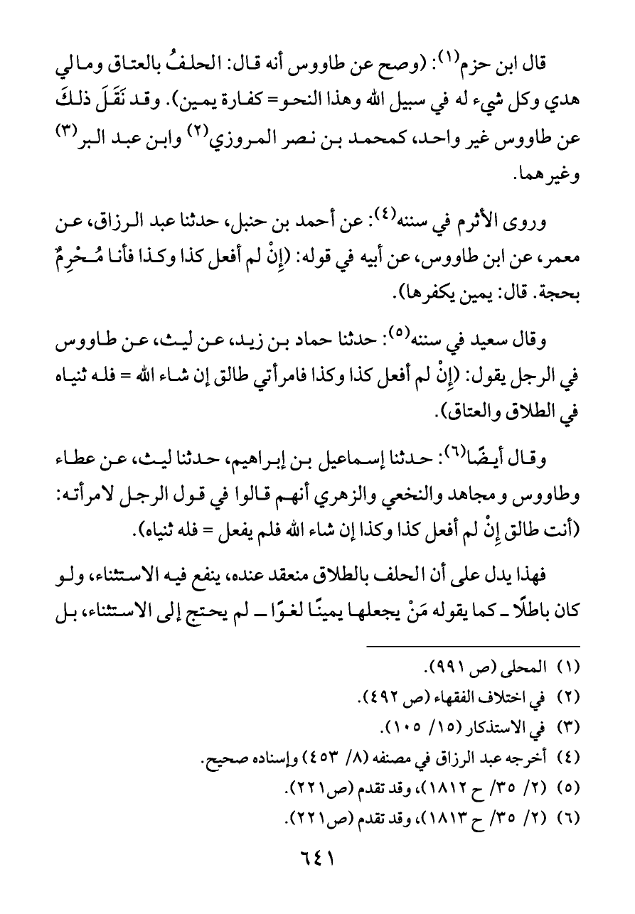قال ابن حزم (¬١): (وصح عن طاووس أنه قال: الحلفُ بالعتاق ومالي هدي وكل شيء له في سبيل الله وهذا النحو= كفارة يمين). وقد نَقَلَ ذلكَ عن طاووس غير واحد، كمحمد بن نصر المروزي (¬٢) وابن عبد البر (¬٣) وغيرهما.