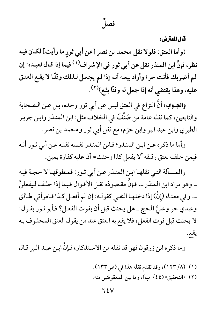 والمسألة التي نقلها ابن المنذر عن أبي ثور: فمنطوقها لا حجة فيه ــ وهو مراد ابن المنذر ــ، فإنَّ مقصودَه نقل الأقوال فيما إذا حلف ليفعلنَّ ــ وفي معناه (إِنْ) إذا دخلها النفي كقوله: إن لم أفعل كذا فامرأتي طالق وعبدي حر وعليَّ الحج ــ هل يحنث قبل أن يفوت الفعل؟ فأبو ثور يقول: لا يحنث قبل فوت الفعل، فلا يقع به العتق عند من يقول العتق المحلوف به يقع.