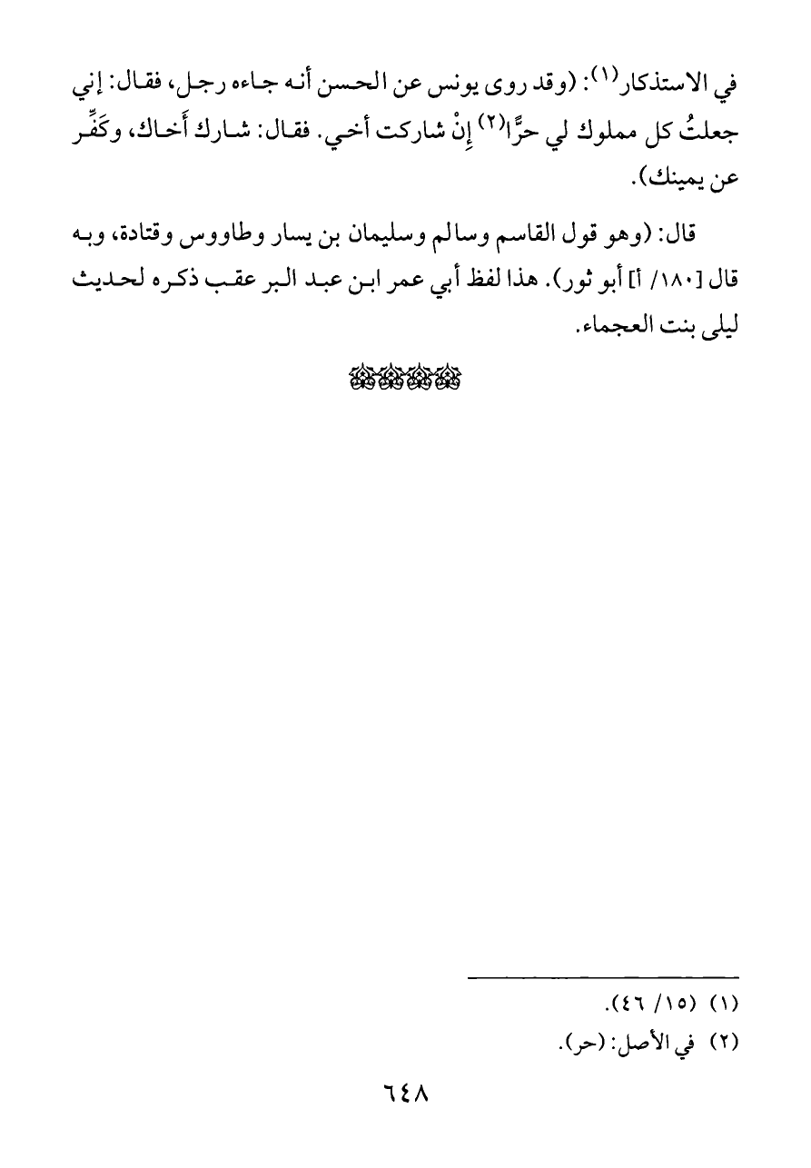 في الاستذكار (¬١): (وقد روى يونس عن الحسن أنه جاءه رجل، فقال: إني جعلتُ كل مملوك لي حرًّا (¬٢) إِنْ شاركت أخي. فقال: شارك أَخاك، وكَفِّر عن يمينك).