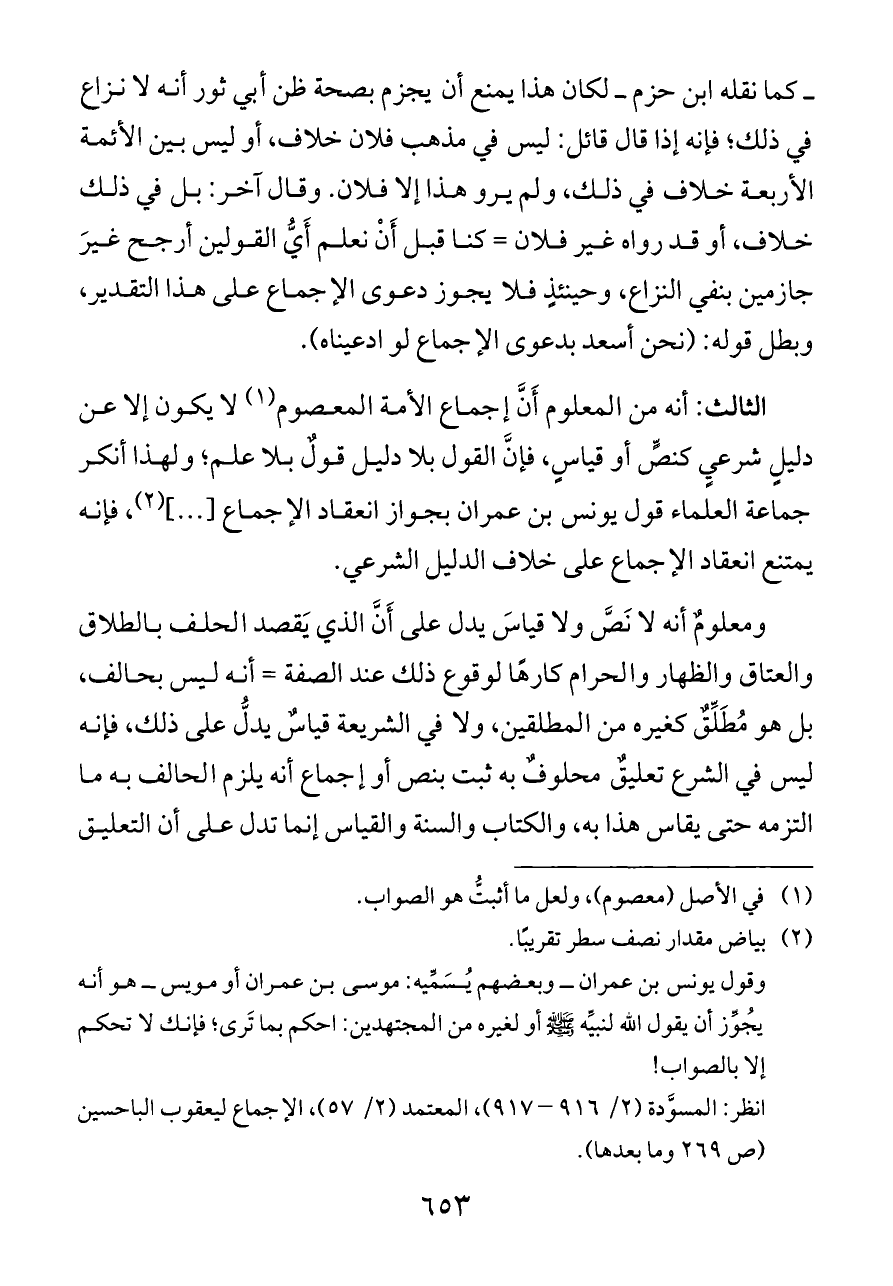 الثالث: أنه من المعلوم أَنَّ إجماع الأمة المعصوم (¬١) لا يكون إلا عن دليلٍ شرعيٍ كنصٍّ أو قياسٍ، فإنَّ القول بلا دليل قولٌ بلا علم؛ ولهذا أنكر جماعة العلماء قول يونس بن عمران بجواز انعقاد الإجماع [ ... ] (¬٢)،