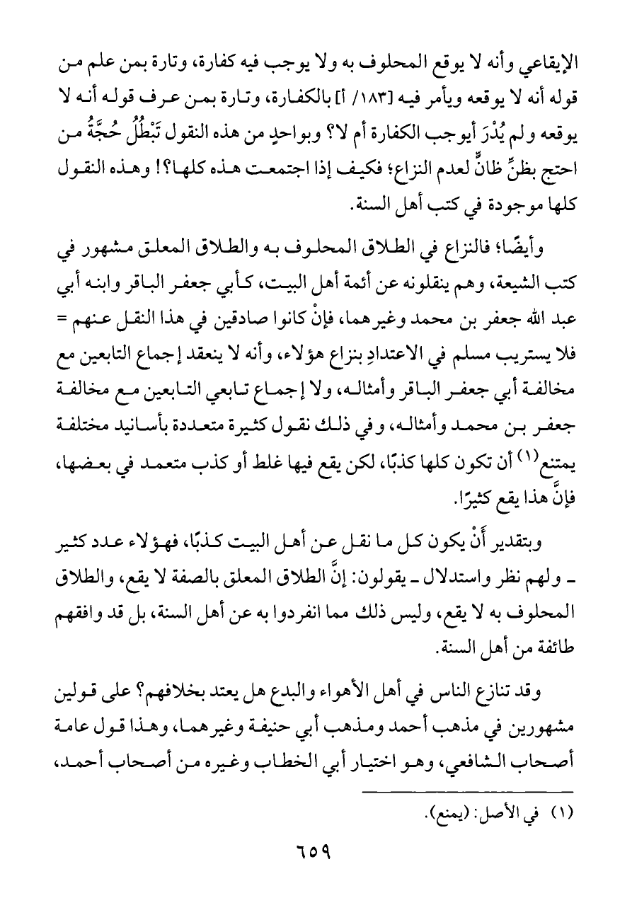 وبتقدير أَنْ يكون كل ما نقل عن أهل البيت كذبًا، فهؤلاء عدد كثير ــ ولهم نظر واستدلال ــ يقولون: إنَّ الطلاق المعلق بالصفة لا يقع، والطلاق المحلوف به لا يقع، وليس ذلك مما انفردوا به عن أهل السنة، بل قد وافقهم طائفة من أهل السنة.