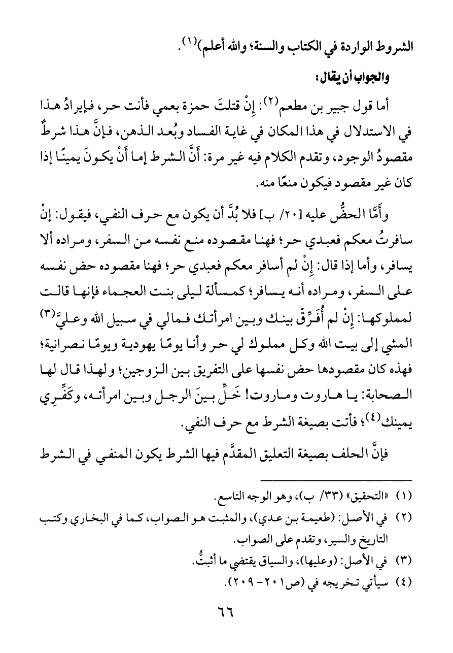 أما قول جبير بن مطعم (¬٢): إِنْ قتلتَ حمزة بعمي فأنت حر، فإيرادُ هذا في الاستدلال في هذا المكان في غاية الفساد وبُعد الذهن، فإنَّ هذا شرطٌ مقصودُ الوجود، وتقدم الكلام فيه غير مرة: أَنَّ الشرط إما أَنْ يكونَ يمينًا إذا كان غير مقصود فيكون منعًا منه.
