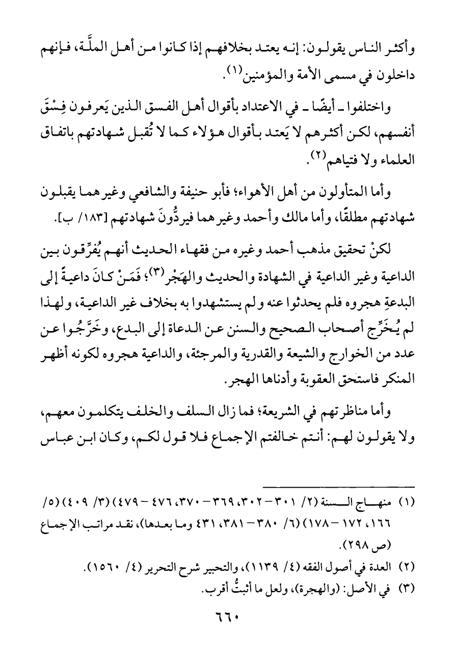 (¬١) منهاج السنة (٢/ ٣٠١ - ٣٠٢، ٣٦٩ - ٣٧٠، ٤٧٦ - ٤٧٩) (٣/ ٤٠٩) (٥/ ١٦٦، ١٧٢ - ١٧٨) (٦/ ٣٨٠ - ٣٨١، ٤٣١ وما بعدها)، نقد مراتب الإجماع (ص ٢٩٨).