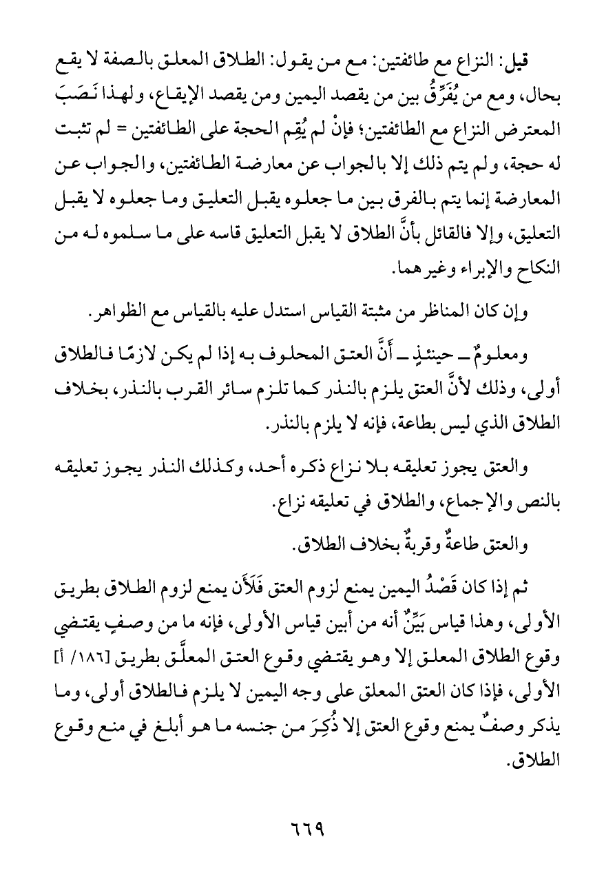 ومعلومٌ ــ حينئذٍ ــ أَنَّ العتق المحلوف به إذا لم يكن لازمًا فالطلاق أولى، وذلك لأنَّ العتق يلزم بالنذر كما تلزم سائر القرب بالنذر، بخلاف الطلاق الذي ليس بطاعة، فإنه لا يلزم بالنذر.