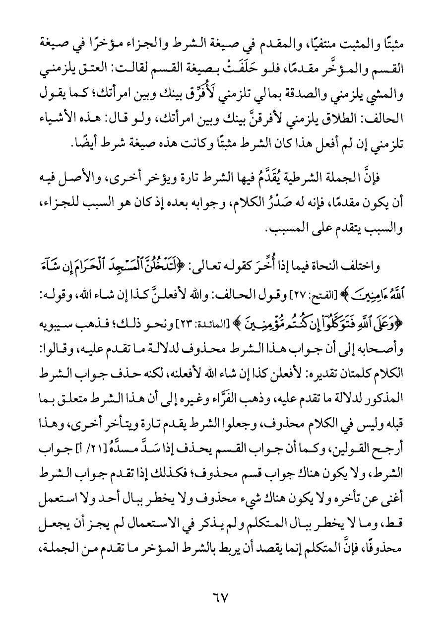 واختلف النحاة فيما إذا أُخِّرَ كقوله تعالى: {لَتَدْخُلُنَّ الْمَسْجِدَ الْحَرَامَ إِنْ شَاءَ اللَّهُ آمِنِينَ} [الفتح: ٢٧] وقول الحالف: والله لأفعلنَّ كذا إن شاء الله، وقوله: {وَعَلَى اللَّهِ فَتَوَكَّلُوا إِنْ كُنْتُمْ مُؤْمِنِينَ} [المائدة: ٢٣] ونحو ذلك؛ فذهب سيبويه وأصحابه إلى أن جواب هذا الشرط محذوف لدلالة ما تقدم عليه، وقالوا: الكلام كلمتان تقديره: لأفعلن كذا إن شاء الله لأفعلنه، لكنه حذف جواب الشرط المذكور لدلالة ما تقدم عليه، وذهب الفَرَّاء وغيره إلى أن هذا الشرط متعلق بما قبله وليس في الكلام محذوف، وجعلوا الشرط يقدم تارة ويتأخر أخرى، وهذا أرجح القولين، وكما أن جواب القسم يحذف إذا سَدَّ مسدَّهُ [٢١/ أ] جواب الشرط، ولا يكون هناك جواب قسم محذوف؛ فكذلك إذا تقدم جواب الشرط أغنى عن تأخره ولا يكون هناك شيء محذوف ولا يخطر ببال أحد ولا استعمل قط، وما لا يخطر ببال المتكلم ولم يذكر في الاستعمال لم يجز أن يجعل محذوفًا، فإنَّ المتكلم إنما يقصد أن يربط بالشرط المؤخر ما تقدم من الجملة,
