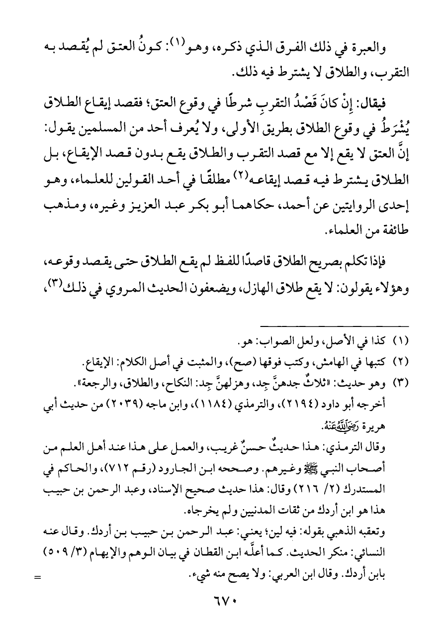 فيقال: إِنْ كانَ قَصْدُ التقربِ شرطًا في وقوع العتق؛ فقصد إيقاع الطلاق يُشْرَطُ في وقوع الطلاق بطريق الأولى، ولا يُعرف أحد من المسلمين يقول: إنَّ العتق لا يقع إلا مع قصد التقرب والطلاق يقع بدون قصد الإيقاع، بل الطلاق يشترط فيه قصد إيقاعه (¬٢) مطلقًا في أحد القولين للعلماء، وهو إحدى الروايتين عن أحمد، حكاهما أبو بكر عبد العزيز وغيره، ومذهب طائفة من العلماء.