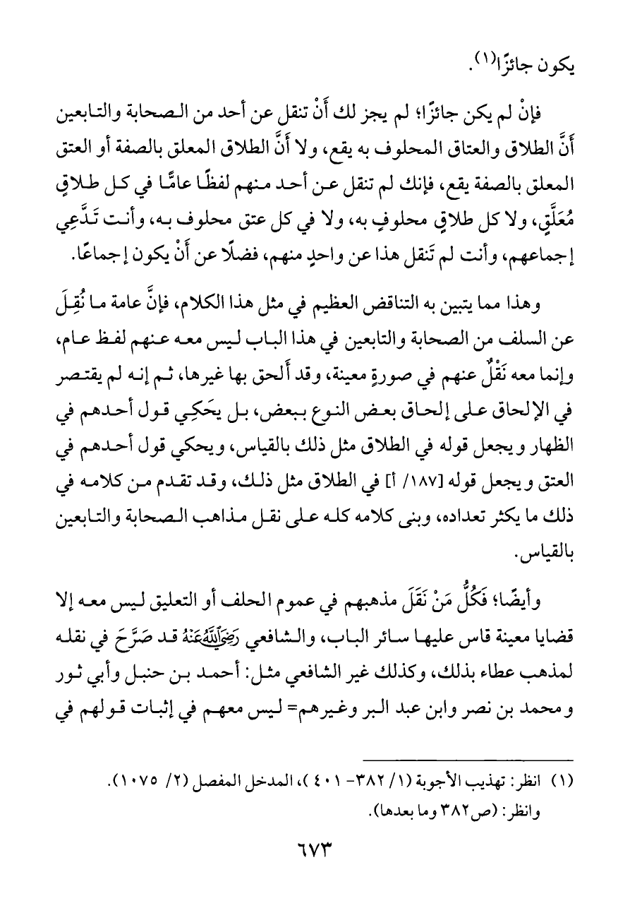 فإنْ لم يكن جائزًا؛ لم يجز لك أَنْ تنقل عن أحد من الصحابة والتابعين أَنَّ الطلاق والعتاق المحلوف به يقع، ولا أَنَّ الطلاق المعلق بالصفة أو العتق المعلق بالصفة يقع، فإنك لم تنقل عن أحد منهم لفظًا عامًّا في كل طلاقٍ مُعَلَّقٍ، ولا كل طلاقٍ محلوفٍ به، ولا في كل عتق محلوف به، وأنت تَدَّعِي إجماعهم، وأنت لم تَنقل هذا عن واحدٍ منهم، فضلًا عن أَنْ يكون إجماعًا.