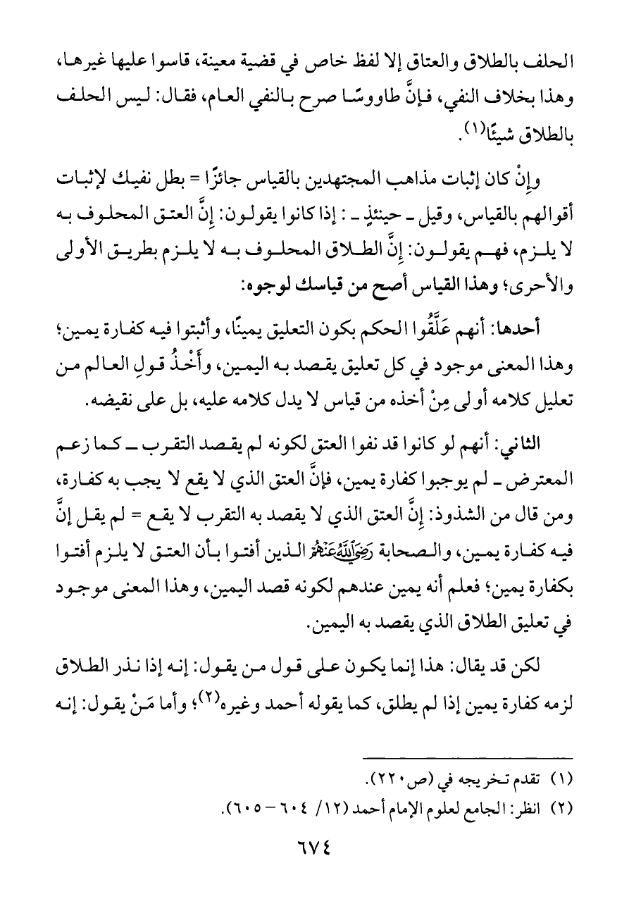 وإِنْ كان إثبات مذاهب المجتهدين بالقياس جائزًا = بطل نفيك لإثبات أقوالهم بالقياس، وقيل ــ حينئذٍ ــ: إذا كانوا يقولون: إِنَّ العتق المحلوف به لا يلزم، فهم يقولون: إِنَّ الطلاق المحلوف به لا يلزم بطريق الأولى والأحرى؛ وهذا القياس أصح من قياسك لوجوه: