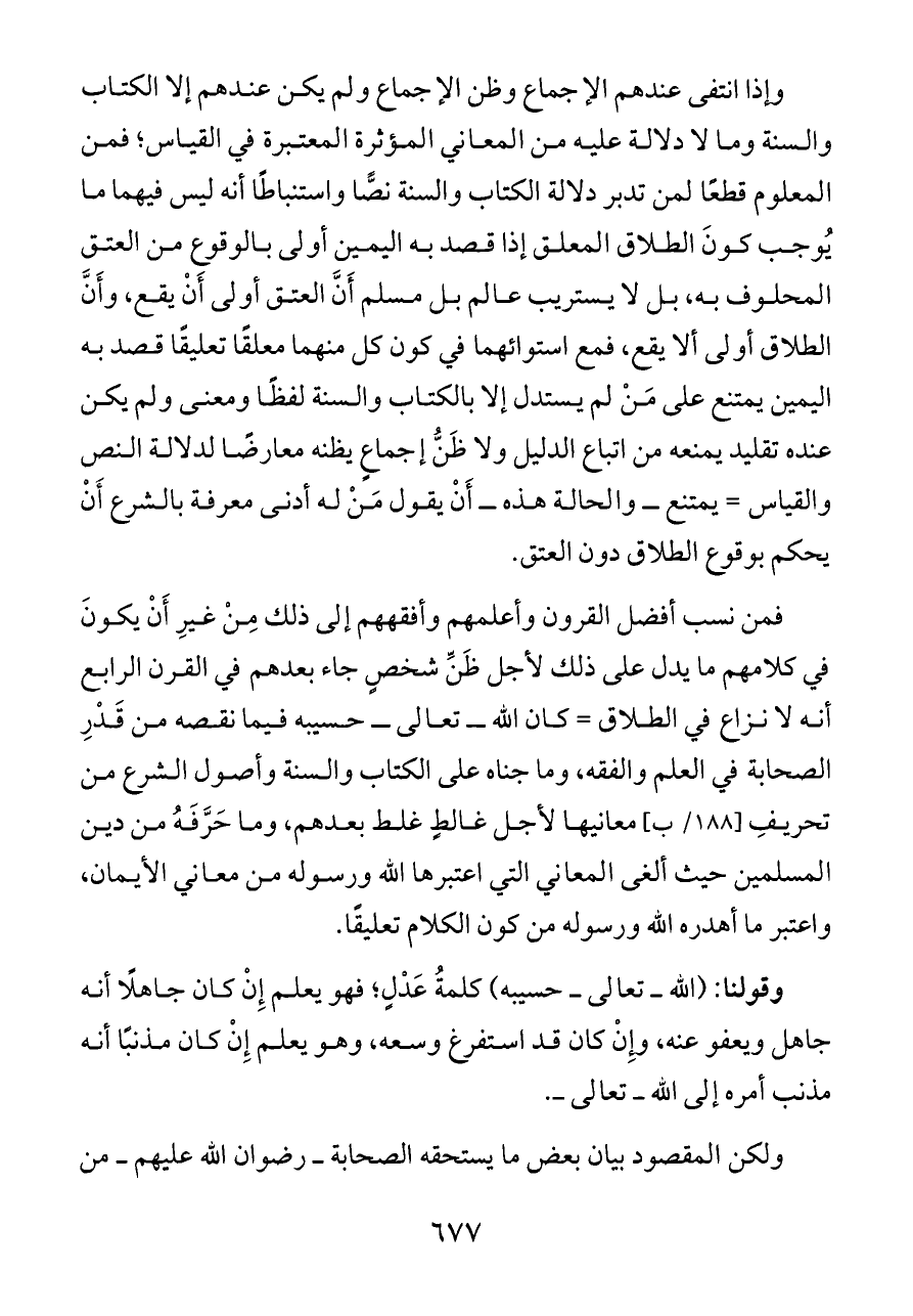 فمن نسب أفضل القرون وأعلمهم وأفقههم إلى ذلك مِنْ غيرِ أَنْ يكونَ في كلامهم ما يدل على ذلك لأجل ظَنِّ شخصٍ جاء بعدهم في القرن الرابع أنه لا نزاع في الطلاق = كان الله ــ تعالى ــ حسيبه فيما نقصه من قَدْرِ الصحابة في العلم والفقه، وما جناه على الكتاب والسنة وأصول الشرع من تحريفِ [١٨٨/ ب] معانيها لأجل غالطٍ غلط بعدهم، وما حَرَّفَهُ من دين المسلمين حيث ألغى المعاني التي اعتبرها الله ورسوله من معاني الأيمان، واعتبر ما أهدره الله ورسوله من كون الكلام تعليقًا.
