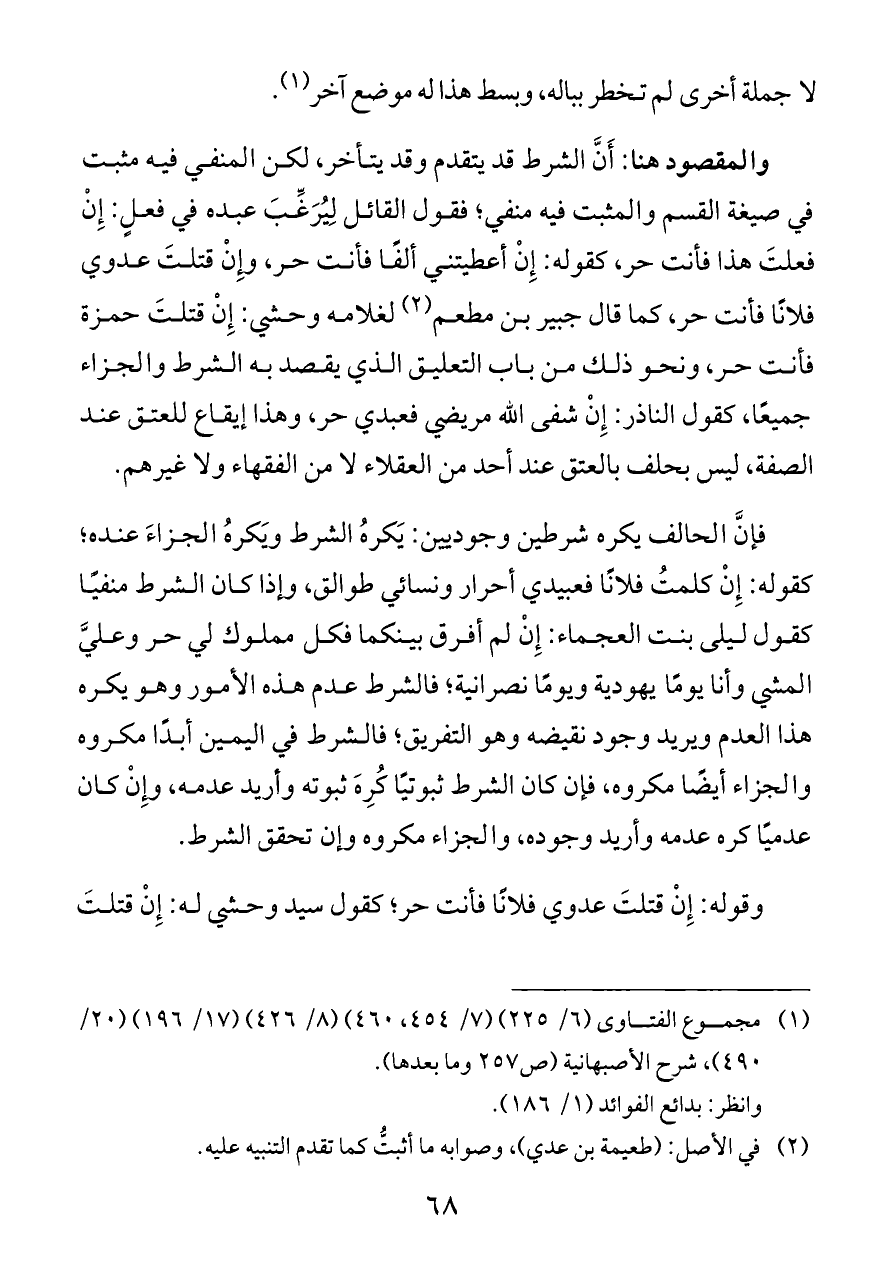 والمقصود هنا: أَنَّ الشرط قد يتقدم وقد يتأخر، لكن المنفي فيه مثبت في صيغة القسم والمثبت فيه منفي؛ فقول القائل لِيُرَغِّبَ عبده في فعلٍ: إِنْ فعلتَ هذا فأنت حر، كقوله: إِنْ أعطيتني ألفًا فأنت حر، وإِنْ قتلتَ عدوي فلانًا فأنت حر، كما قال جبير بن مطعم (¬٢) لغلامه وحشي: إِنْ قتلتَ حمزة فأنت حر، ونحو ذلك من باب التعليق الذي يقصد به الشرط والجزاء جميعًا، كقول الناذر: إِنْ شفى الله مريضي فعبدي حر، وهذا إيقاع للعتق عند الصفة، ليس بحلف بالعتق عند أحد من العقلاء لا من الفقهاء ولا غيرهم.