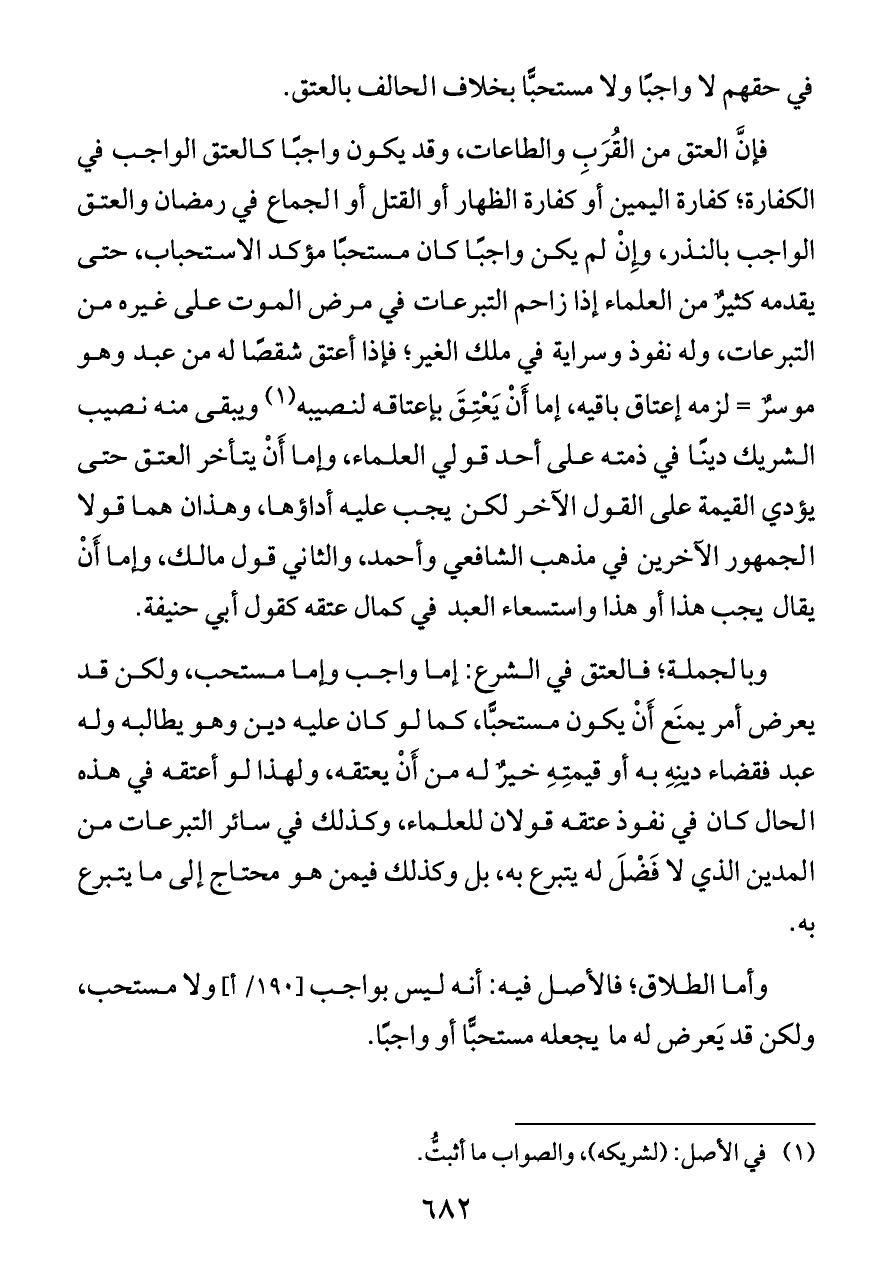 وبالجملة؛ فالعتق في الشرع: إما واجب وإما مستحب، ولكن قد يعرض أمر يمنَع أَنْ يكون مستحبًّا، كما لو كان عليه دين وهو يطالبه وله عبد فقضاء دينِهِ به أو قيمتِهِ خيرٌ له من أَنْ يعتقه، ولهذا لو أعتقه في هذه الحال كان في نفوذ عتقه قولان للعلماء، وكذلك في سائر التبرعات من المدين الذي لا فَضْلَ له يتبرع به، بل وكذلك فيمن هو محتاج إلى ما يتبرع به.