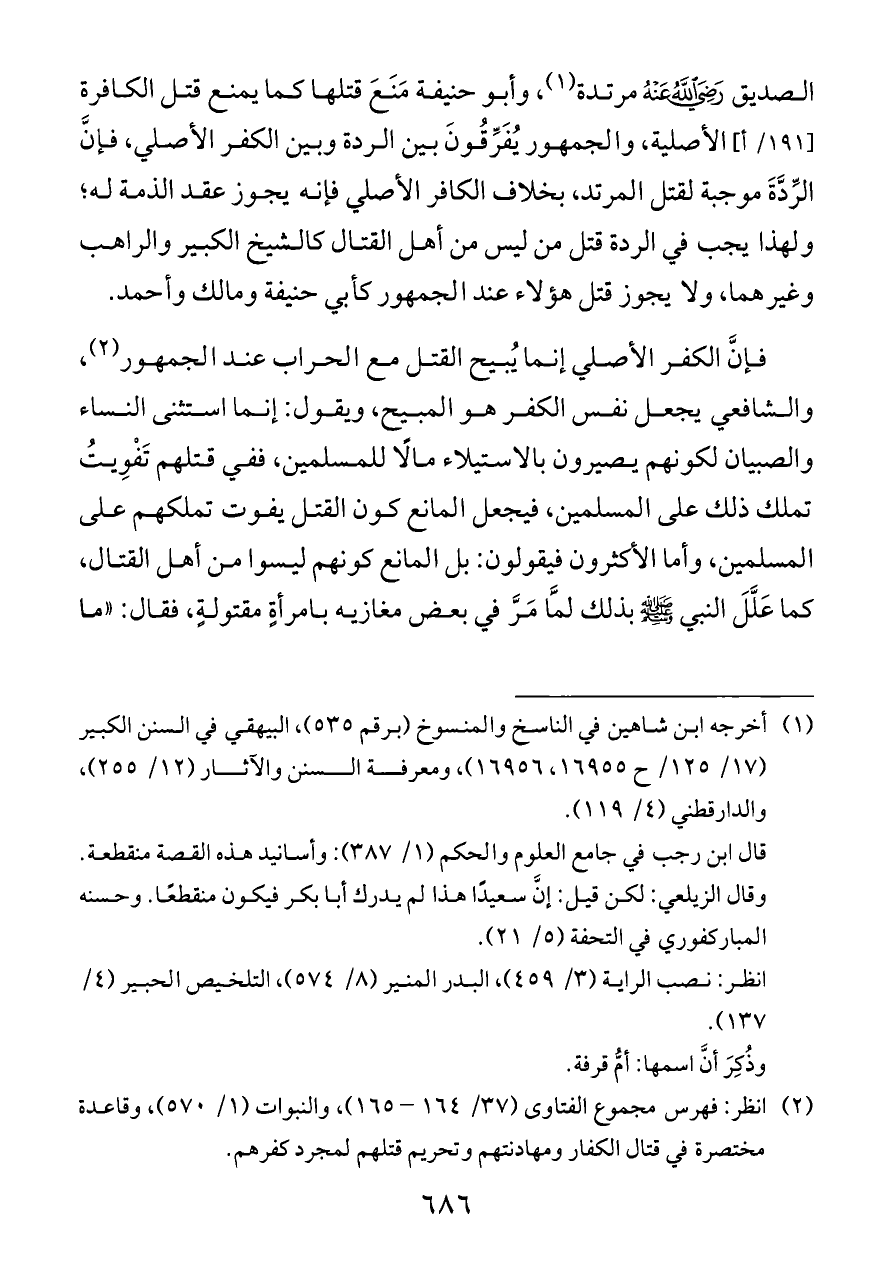 فإنَّ الكفر الأصلي إنما يُبيح القتل مع الحراب عند الجمهور (¬٢)، والشافعي يجعل نفس الكفر هو المبيح، ويقول: إنما استثنى النساء والصبيان لكونهم يصيرون بالاستيلاء مالًا للمسلمين، ففي قتلهم تَفْوِيتُ تملك ذلك على المسلمين، فيجعل المانع كون القتل يفوت تملكهم على المسلمين، وأما الأكثرون فيقولون: بل المانع كونهم ليسوا من أهل القتال، كما عَلَّلَ النبي - صلى الله عليه وسلم - بذلك لَمَّا مَرَّ في بعض مغازيه بامرأةٍ مقتولةٍ، فقال: «ما