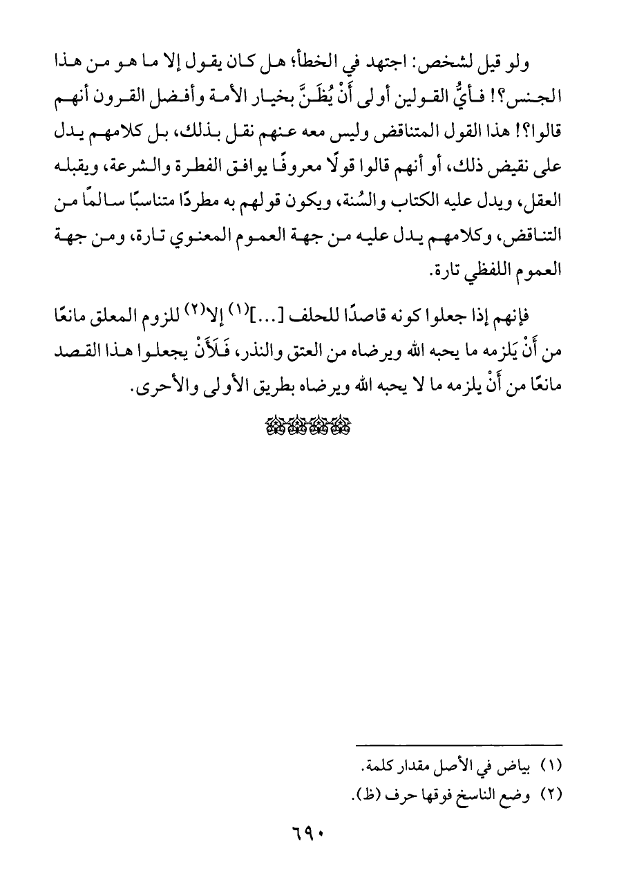 ولو قيل لشخص: اجتهد في الخطأ؛ هل كان يقول إلا ما هو من هذا الجنس؟! فأيُّ القولين أولى أَنْ يُظَنَّ بخيار الأمة وأفضل القرون أنهم قالوا؟! هذا القول المتناقض وليس معه عنهم نقل بذلك، بل كلامهم يدل على نقيض ذلك، أو أنهم قالوا قولًا معروفًا يوافق الفطرة والشرعة، ويقبله العقل، ويدل عليه الكتاب والسُنة، ويكون قولهم به مطردًا متناسبًا سالمًا من التناقض، وكلامهم يدل عليه من جهة العموم المعنوي تارة، ومن جهة العموم اللفظي تارة.