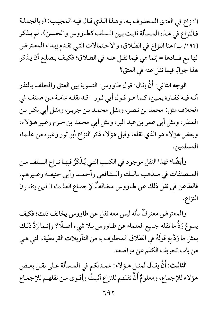 النزاع في العتق المحلوف به، وهذا الذي قال فيه المجيب: (وبالجملة فالنزاع في هذه المسألة ثابت بين السلف كطاووس والحسن). لم يذكر [١٩٢/ ب] هنا النزاع في الطلاق، والاحتمالات التي تقدم إبداء المعترض لها مع فسادها = إنما هي فيما نقل عنه في الطلاق؛ فكيف يصلح أن يذكر هذا جوابًا فيما نقل عنه في العتق؟