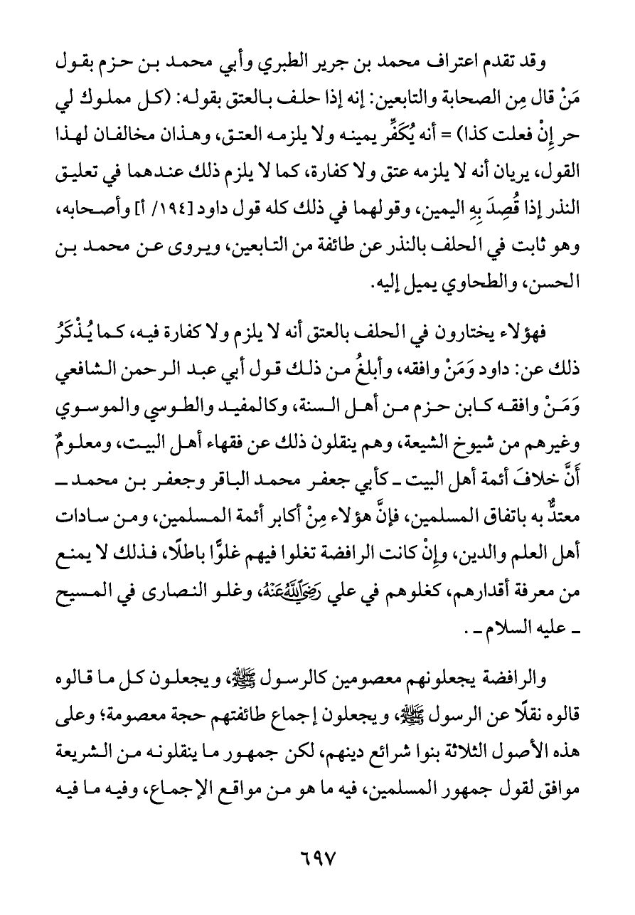 فهؤلاء يختارون في الحلف بالعتق أنه لا يلزم ولا كفارة فيه، كما يُذْكَرُ ذلك عن: داود وَمَنْ وافقه، وأبلغُ من ذلك قول أبي عبد الرحمن الشافعي وَمَنْ وافقه كابن حزم من أهل السنة، وكالمفيد والطوسي والموسوي وغيرهم من شيوخ الشيعة، وهم ينقلون ذلك عن فقهاء أهل البيت، ومعلومٌ أَنَّ خلافَ أئمة أهل البيت ــ كأبي جعفر محمد الباقر وجعفر بن محمد ــ معتدٌّ به باتفاق المسلمين، فإنَّ هؤلاء مِنْ أكابر أئمة المسلمين، ومن سادات أهل العلم والدين، وإِنْ كانت الرافضة تغلوا فيهم غلوًّا باطلًا، فذلك لا يمنع من معرفة أقدارهم، كغلوهم في علي - رضي الله عنه -، وغلو النصارى في المسيح ــ عليه السلام ــ.