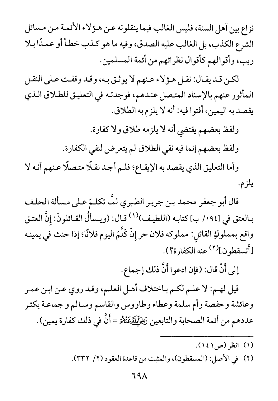 قال أبو جعفر محمد بن جرير الطبري لمَّا تكلمَ على مسألة الحلف بالعتق في [١٩٤/ ب] كتابه (اللطيف) (¬١) قال: (ويسألُ القائلونَ: إِنَّ العتق واقع بمملوكِ القائلِ: مملوكه فلان حر إِنْ كَلَّمَ اليوم فلانًا؛ إذا حنث في يمينه [أَتسقطون] (¬٢) عنه الكفارة؟).