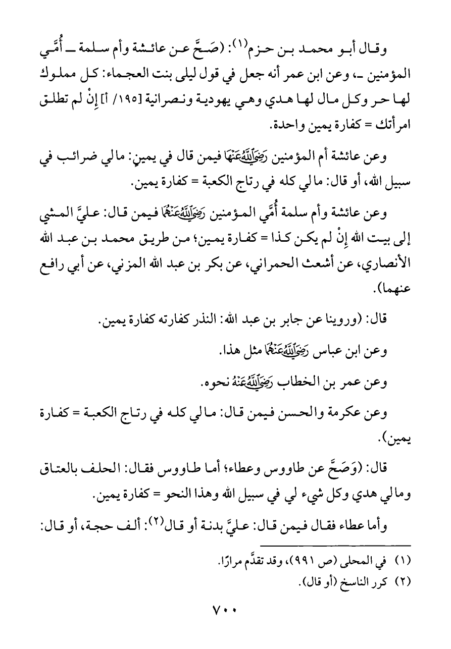 وقال أبو محمد بن حزم (¬١): (صَحَّ عن عائشة وأم سلمة ــ أُمَّي المؤمنين ــ، وعن ابن عمر أنه جعل في قول ليلى بنت العجماء: كل مملوك لها حر وكل مال لها هدي وهي يهودية ونصرانية [١٩٥/ أ] إِنْ لم تطلق امرأتك = كفارة يمين واحدة.