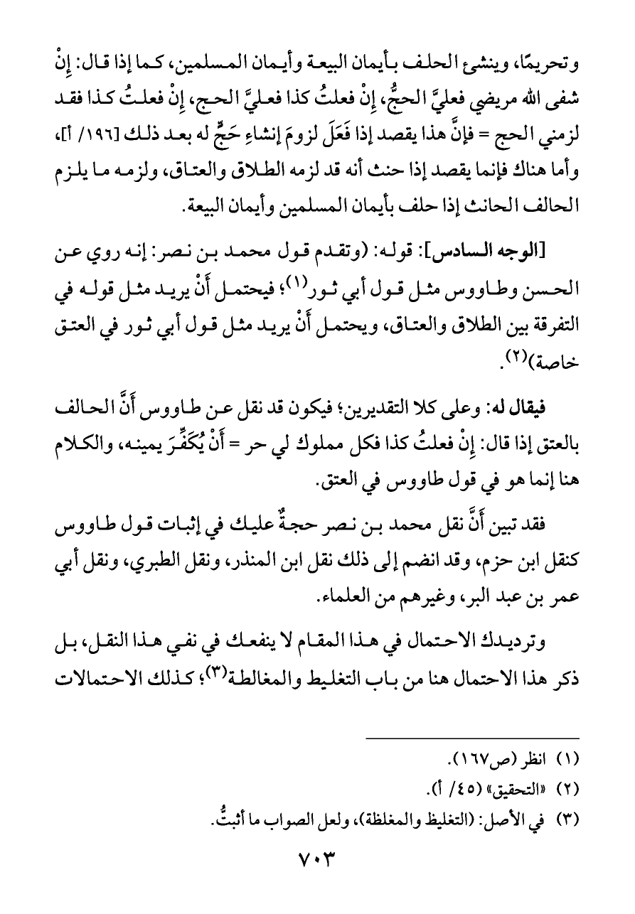 [الوجه السادس]: قوله: (وتقدم قول محمد بن نصر: إنه روي عن الحسن وطاووس مثل قول أبي ثور (¬١)؛ فيحتمل أَنْ يريد مثل قوله في التفرقة بين الطلاق والعتاق، ويحتمل أَنْ يريد مثل قول أبي ثور في العتق خاصة) (¬٢).