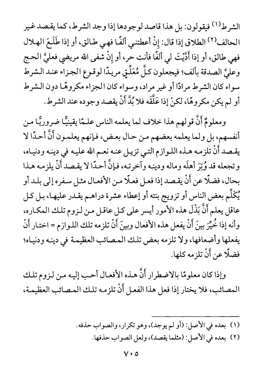 ومعلومٌ أَنَّ قولهم هذا خلاف لما يعلمه الناس علمًا يقينيًّا ضروريًّا من أنفسهم، بل ولما يعلمه بعضهم من حال بعض، فإنهم يعلمون أَنَّ أحدًا لا يقصد أَنْ تلزمه هذه اللوازم التي تزيل عنه نعم الله عليه في دينه ودنياه، وتجعله قد وُتِرَ أهلَه وماله ودينه وآخرته، فإنَّ أحدًا لا يقصد أَنْ يلزمه هذا بحال، فضلًا عن أَنْ يقصد إذا فعل فعلًا من الأفعال مثل سفره إلى بلد أو يُكَلِّم بعض الناس أو تزويج بنته أو إعطاء عشرة دراهم يقدر عليها، بل كل عاقل يعلم أَنَّ بَذْلَ هذه الأمور أيسر على كل عاقل من لزوم تلك المكاره، وأنه إذا خُيِّرَ بينَ أَنْ يفعل هذه الأفعال وبينَ أَنْ تلزمه تلك اللوازم = اختار أَنْ يفعلها وأضعافها، ولا تلزمه بعض تلك المصائب العظيمة في دينه ودنياه؛ فضلًا عن أَنْ تلزمه كلها.