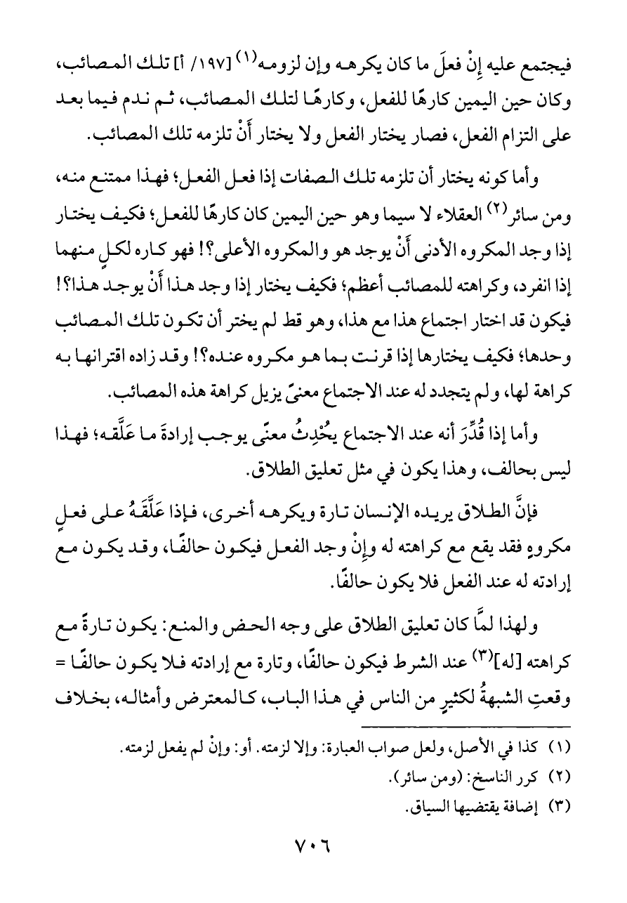 وأما كونه يختار أن تلزمه تلك الصفات إذا فعل الفعل؛ فهذا ممتنع منه، ومن سائر (¬٢) العقلاء لا سيما وهو حين اليمين كان كارهًا للفعل؛ فكيف يختار إذا وجد المكروه الأدنى أَنْ يوجد هو والمكروه الأعلى؟! فهو كاره لكلٍ منهما إذا انفرد، وكراهته للمصائب أعظم؛ فكيف يختار إذا وجد هذا أَنْ يوجد هذا؟! فيكون قد اختار اجتماع هذا مع هذا، وهو قط لم يختر أن تكون تلك المصائب وحدها؛ فكيف يختارها إذا قرنت بما هو مكروه عنده؟! وقد زاده اقترانها به كراهة لها، ولم يتجدد له عند الاجتماع معنىً يزيل كراهة هذه المصائب.