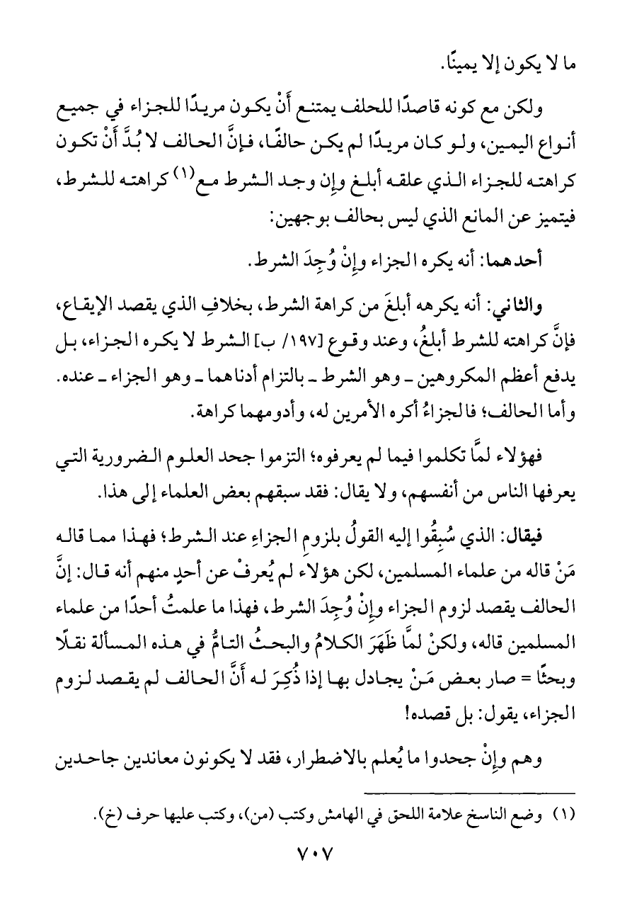 فيقال: الذي سُبِقُوا إليه القولُ بلزومِ الجزاءِ عند الشرط؛ فهذا مما قاله مَنْ قاله من علماء المسلمين، لكن هؤلاء لم يُعرفْ عن أحدٍ منهم أنه قال: إنَّ الحالف يقصد لزوم الجزاء وإِنْ وُجِدَ الشرط، فهذا ما علمتُ أحدًا من علماء المسلمين قاله، ولكنْ لمَّا ظَهَرَ الكلامُ والبحثُ التامُّ في هذه المسألة نقلًا وبحثًا = صار بعض مَنْ يجادل بها إذا ذُكِرَ له أَنَّ الحالف لم يقصد لزوم الجزاء، يقول: بل قصده!