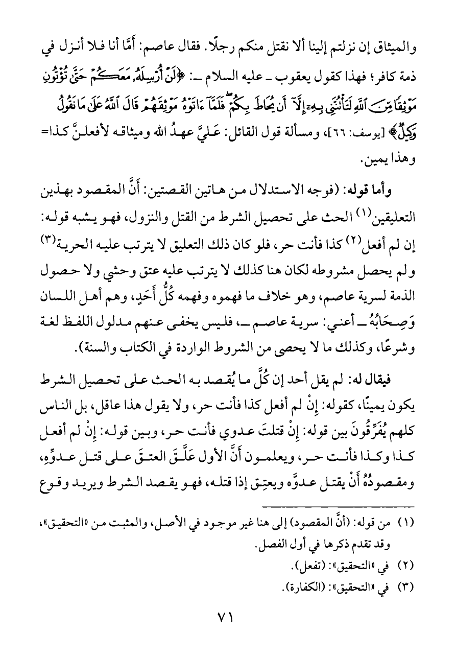 وأما قوله: (فوجه الاستدلال من هاتين القصتين: أَنَّ المقصود بهذين التعليقين (¬١) الحث على تحصيل الشرط من القتل والنزول، فهو يشبه قوله: إن لم أفعل (¬٢) كذا فأنت حر، فلو كان ذلك التعليق لا يترتب عليه الحرية (¬٣) ولم يحصل مشروطه لكان هنا كذلك لا يترتب عليه عتق وحشي ولا حصول الذمة لسرية عاصم، وهو خلاف ما فهموه وفهمه كُلُّ أَحَدٍ، وهم أهل اللسان وَصِحَابُهُ ــ أعني: سرية عاصم ــ، فليس يخفى عنهم مدلول اللفظ لغة وشرعًا، وكذلك ما لا يحصى من الشروط الواردة في الكتاب والسنة).