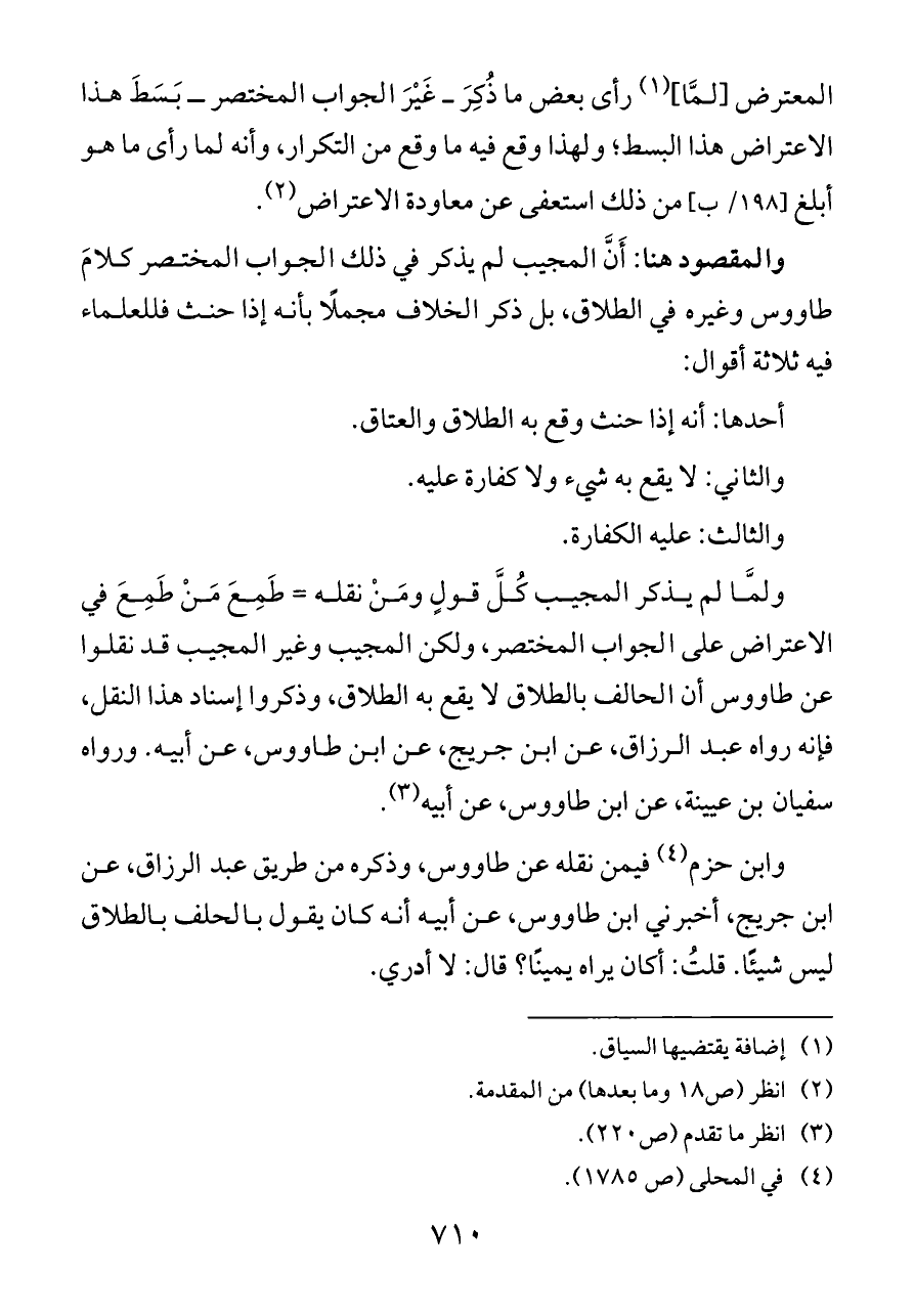 والمقصود هنا: أَنَّ المجيب لم يذكر في ذلك الجواب المختصر كلامَ طاووس وغيره في الطلاق، بل ذكر الخلاف مجملًا بأنه إذا حنث فللعلماء فيه ثلاثة أقوال: