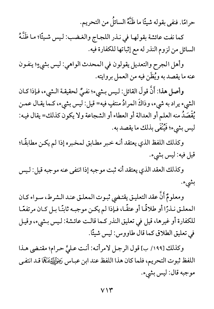 وكذلك [١٩٩/ ب] قول الرجل لامرأته: أنت عليَّ حرام؛ مقتضى هذا اللفظ ثبوت التحريم، فلما كان هذا اللفظ عند ابن عباس - رضي الله عنهما - قد انتفى موجبه قال: ليس بشيء.