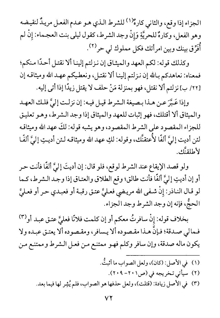 الجزاء إذا وقع، والثاني كارهٌ (¬١) للشرط الذي هو عدم الفعل مريدٌ لنقيضه وهو الفعل، وكارهٌ للحريَّةِ وَإِنْ وجد الشرط، كقول ليلى بنت العجماء: إِنْ لم أُفَرِّق بينك وبين امرأتك فكل مملوك لي حر (¬٢).