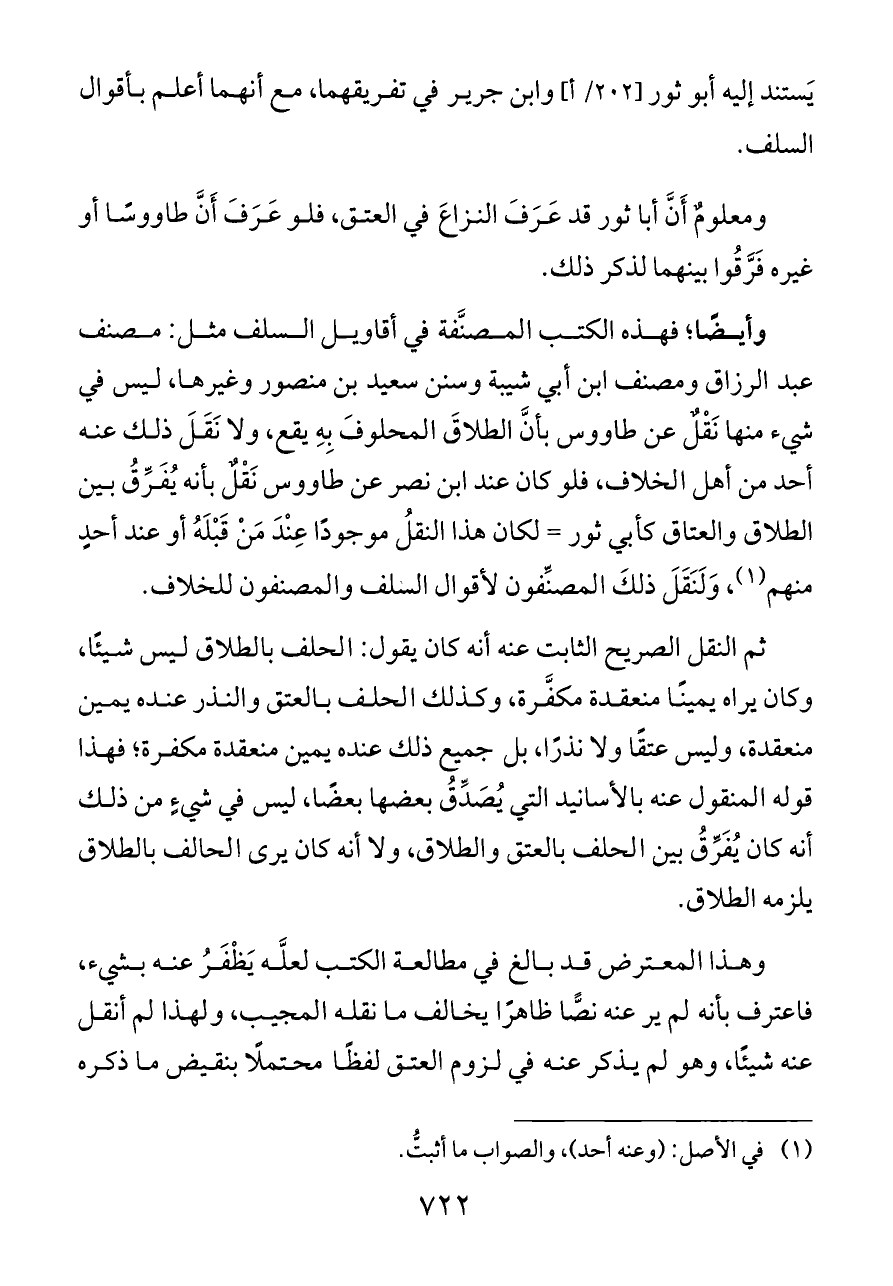 وأيضًا؛ فهذه الكتب المصنَّفة في أقاويل السلف مثل: مصنف عبد الرزاق ومصنف ابن أبي شيبة وسنن سعيد بن منصور وغيرها، ليس في شيء منها نَقْلٌ عن طاووس بأنَّ الطلاقَ المحلوفَ بِهِ يقع، ولا نَقَلَ ذلك عنه أحد من أهل الخلاف، فلو كان عند ابن نصر عن طاووس نَقْلٌ بأنه يُفَرِّقُ بين الطلاق والعتاق كأبي ثور = لكان هذا النقلُ موجودًا عِنْدَ مَنْ قَبْلَهُ أو عند أحدٍ منهم (¬١)، وَلَنَقَلَ ذلكَ المصنِّفون لأقوال السلف والمصنفون للخلاف.