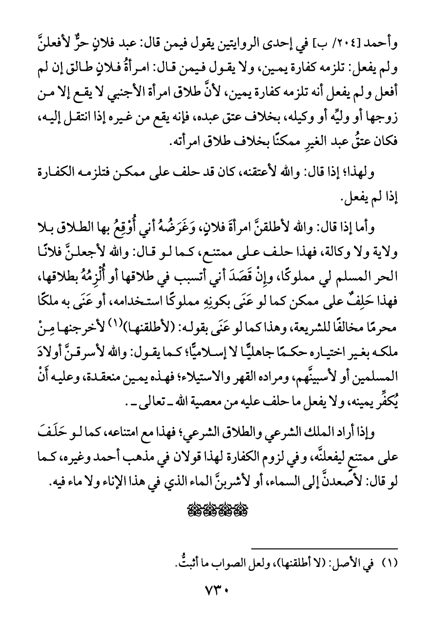 وأما إذا قال: والله لأطلقنَّ امرأةَ فلانٍ، وَغَرَضُهُ أني أُوْقِعُ بها الطلاق بلا ولاية ولا وكالة، فهذا حلف على ممتنع، كما لو قال: والله لأجعلنَّ فلانًا الحر المسلم لي مملوكًا، وإِنْ قَصَدَ أني أتسبب في طلاقها أو أُلْزِمُهُ بطلاقها، فهذا حَلِفٌ على ممكن كما لو عَنَى بكونِهِ مملوكًا استخدامه، أو عَنَى به ملكًا محرمًا مخالفًا للشريعة، وهذا كما لو عَنَى بقوله: (لأطلقنها) (¬١) لأخرجنها مِنْ ملكه بغير اختياره حكمًا جاهليًّا لا إسلاميًّا؛ كما يقول: والله لأسرقنَّ أولادَ المسلمين أو لأسبينَّهم، ومراده القهر والاستيلاء؛ فهذه يمين منعقدة، وعليه أَنْ يُكفِّر يمينه، ولا يفعل ما حلف عليه من معصية الله ــ تعالى ــ.